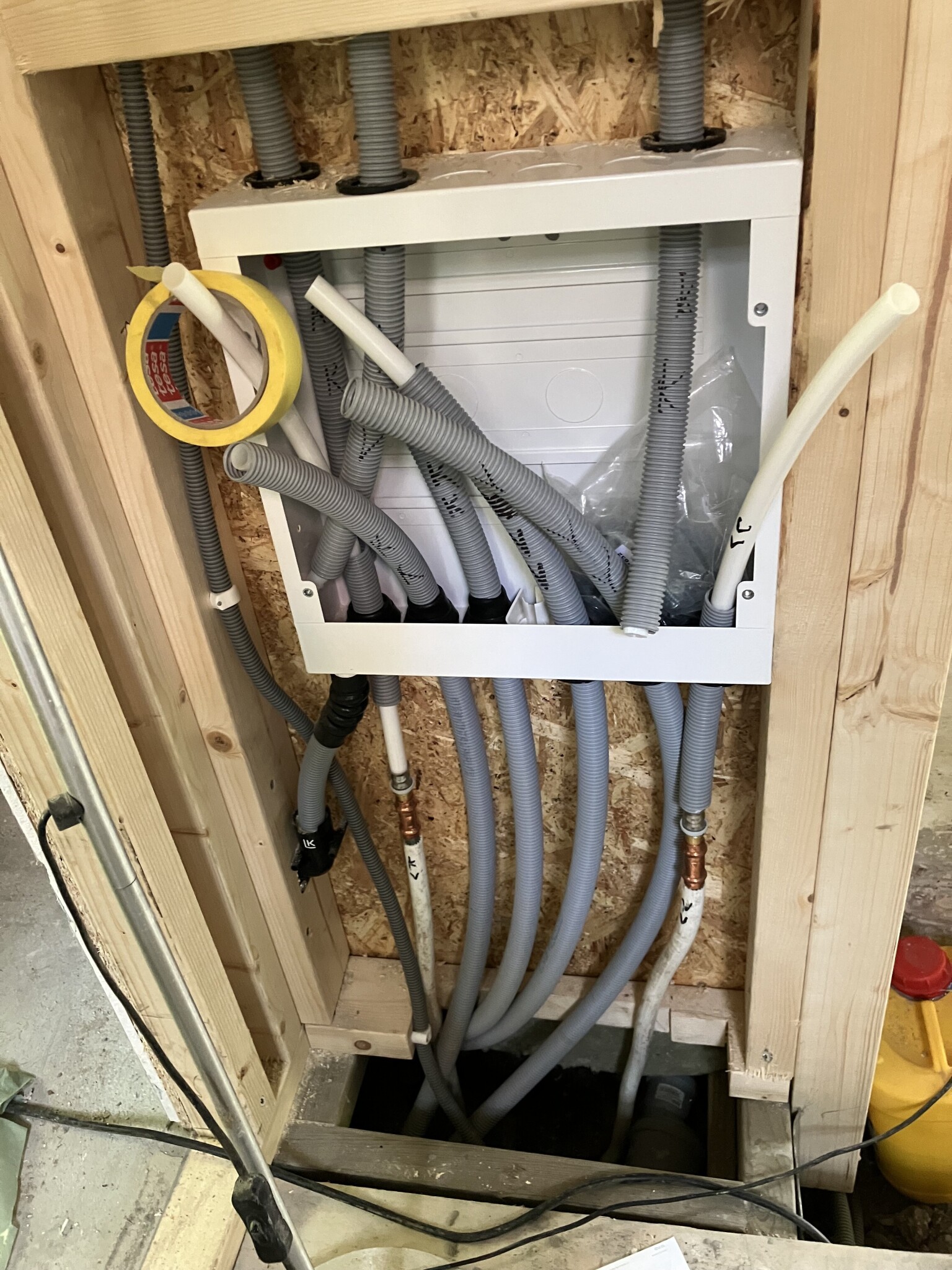 Rörmokaren har flyttat upp fördelarskåpet och skarvat kopparrören under