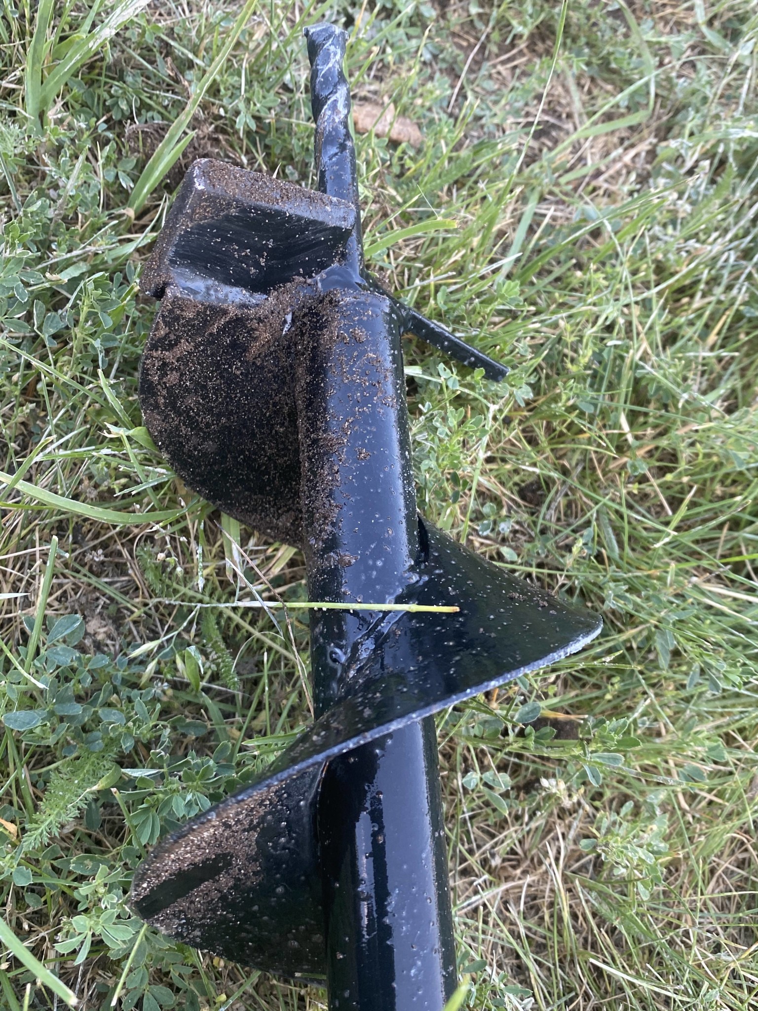 Nu kommer ingen lera mer, bytte till spiralborr för att se om ja får upp något lera... inte en droppe, däremot är det någor nytt lager nu som är lika mörkt som matjord.. titta på spetsen, inget lera alls mer.