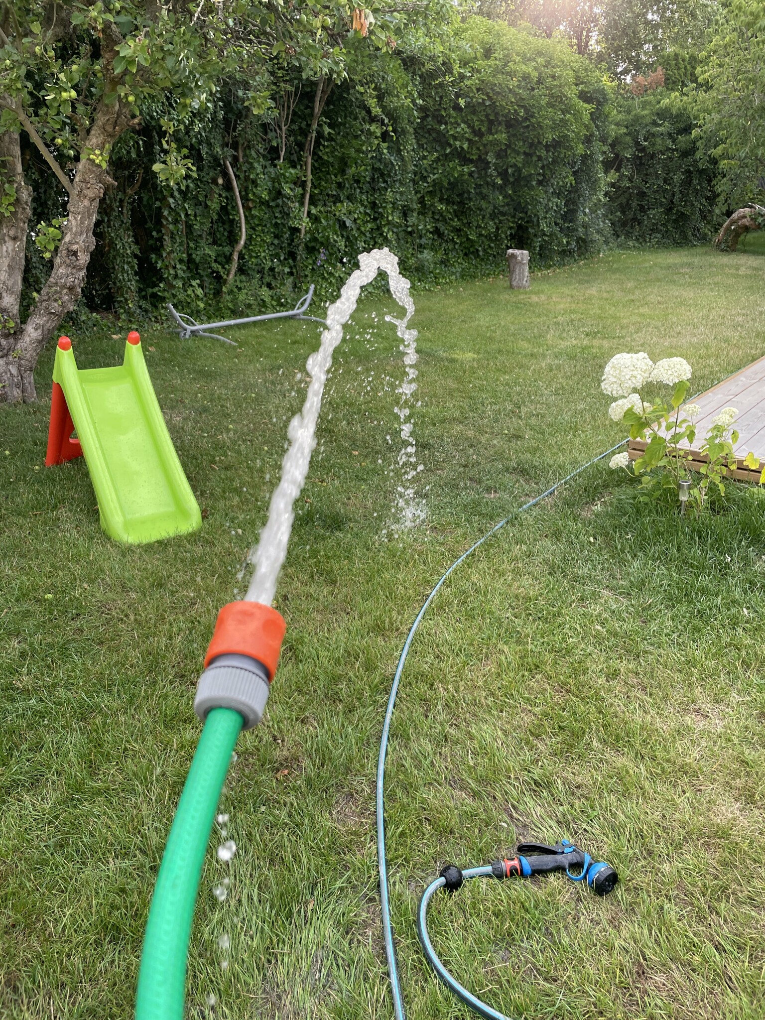 Efter det initiala testet igår så kände jag att det troligen är onödigt arbete att försöka dra upp markrören ytterligare. Skarven som gav sig hamnade i lämplig höjd också (se bild). Det fick bära eller brista… Fyllde igen och kopplade ihop allt som det är tänkt. Lät pumpen gå med fullt flöde ett bra tag och sen gjorde jag första skarpa testet som visade ca 30 liter/min. Jag är nöjd 👍