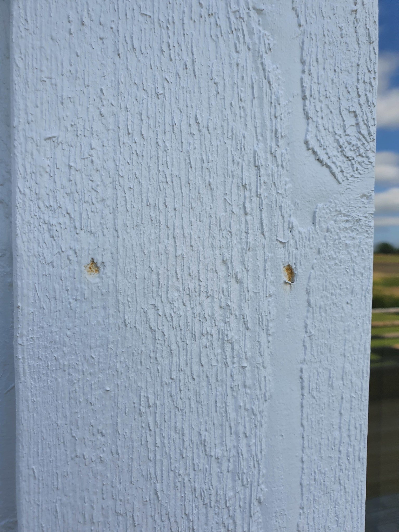 Förmodligen dåliga spikar. Skrapa rent spikskallarna med en gammal kniv, dutta på lite rostskyddsfärg på spikskallarna och måla om fodren så är problemet ur världen.