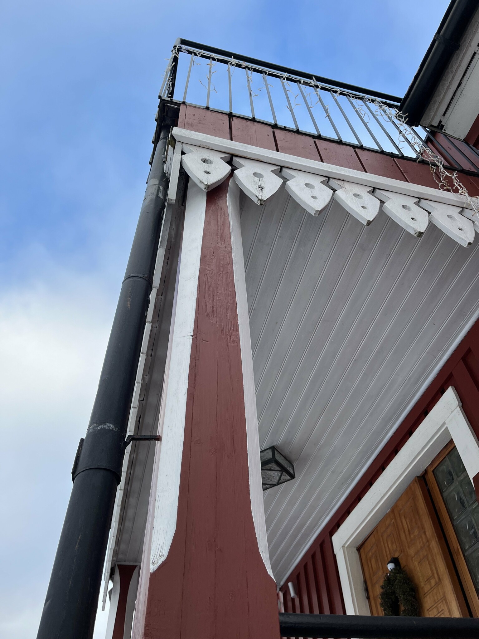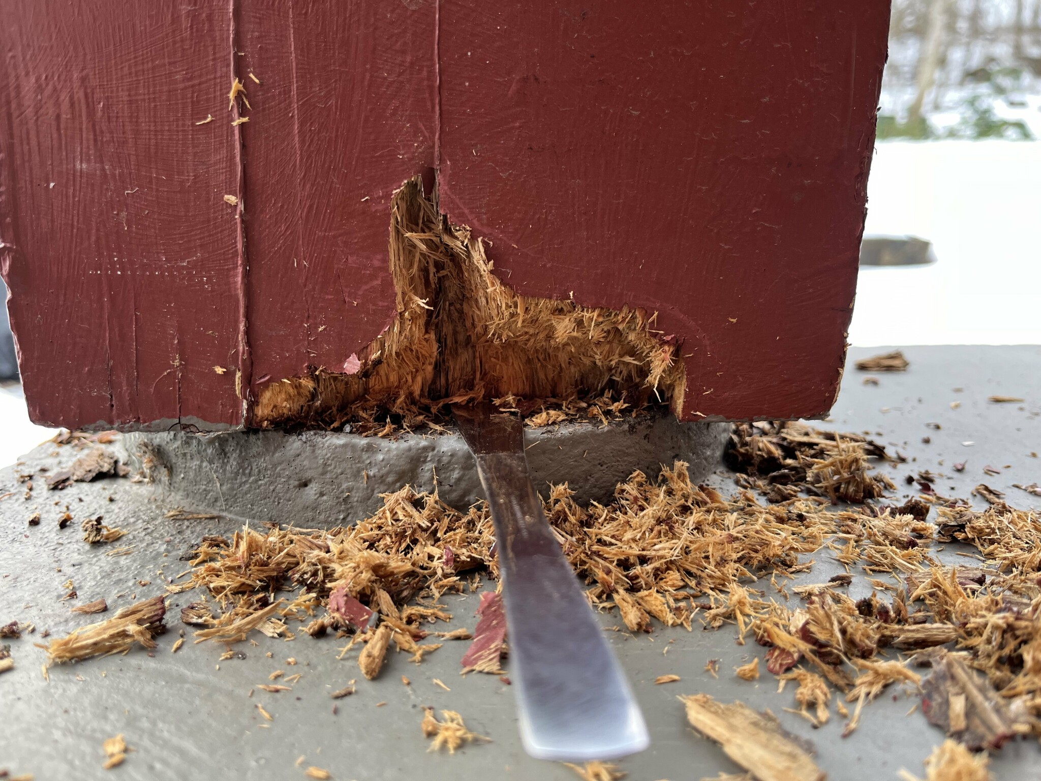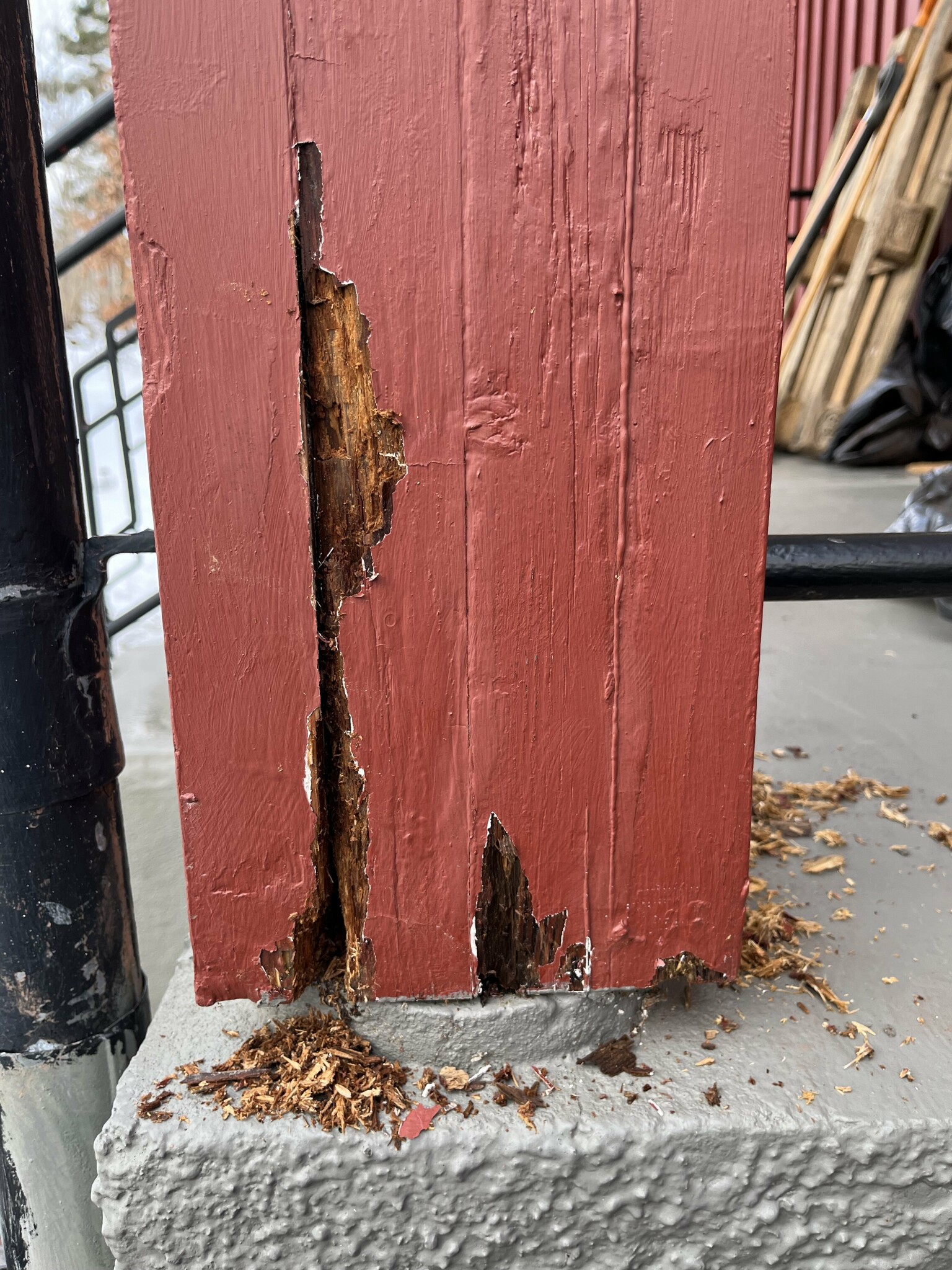 Jag kan trycka in en kniv mellan pelaren och plinten från alla håll, och i mitten träffar kniven något som känns hårt, så jag misstänker att det är någon typ av stål i mitten av pelaren. Kan det vara så att balkongen i själva verket bärs upp av en stålkonstruktion och att träpelaren mest fyller en estetisk funktion? Det är förstås omöjligt att svara på utifrån bild och beskrivning, men någon kanske har erfarenhet av något liknande sedan tidigare?