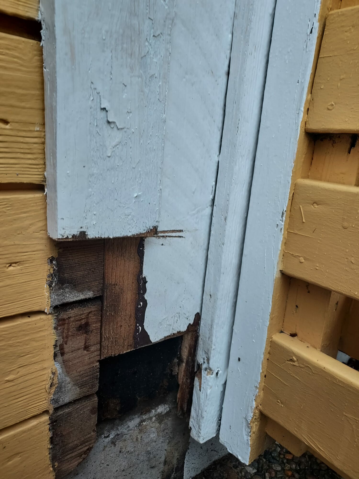 3) Trästycken bakom brädan på fasaden är när man gräver lite från mina föräldrars sida rätt rutten.