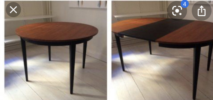 ... jag ärvde ett mycket tungt, runt 150cm pelarbord med 2 iläggsskivor. Särade man på bordet föll de två inbyggda benparen ner för skivornas stabilitet. Fantastisk konstruktion i trä. När bordet fyllde 100 år fräschades det upp och gick vidare till nästa generation.