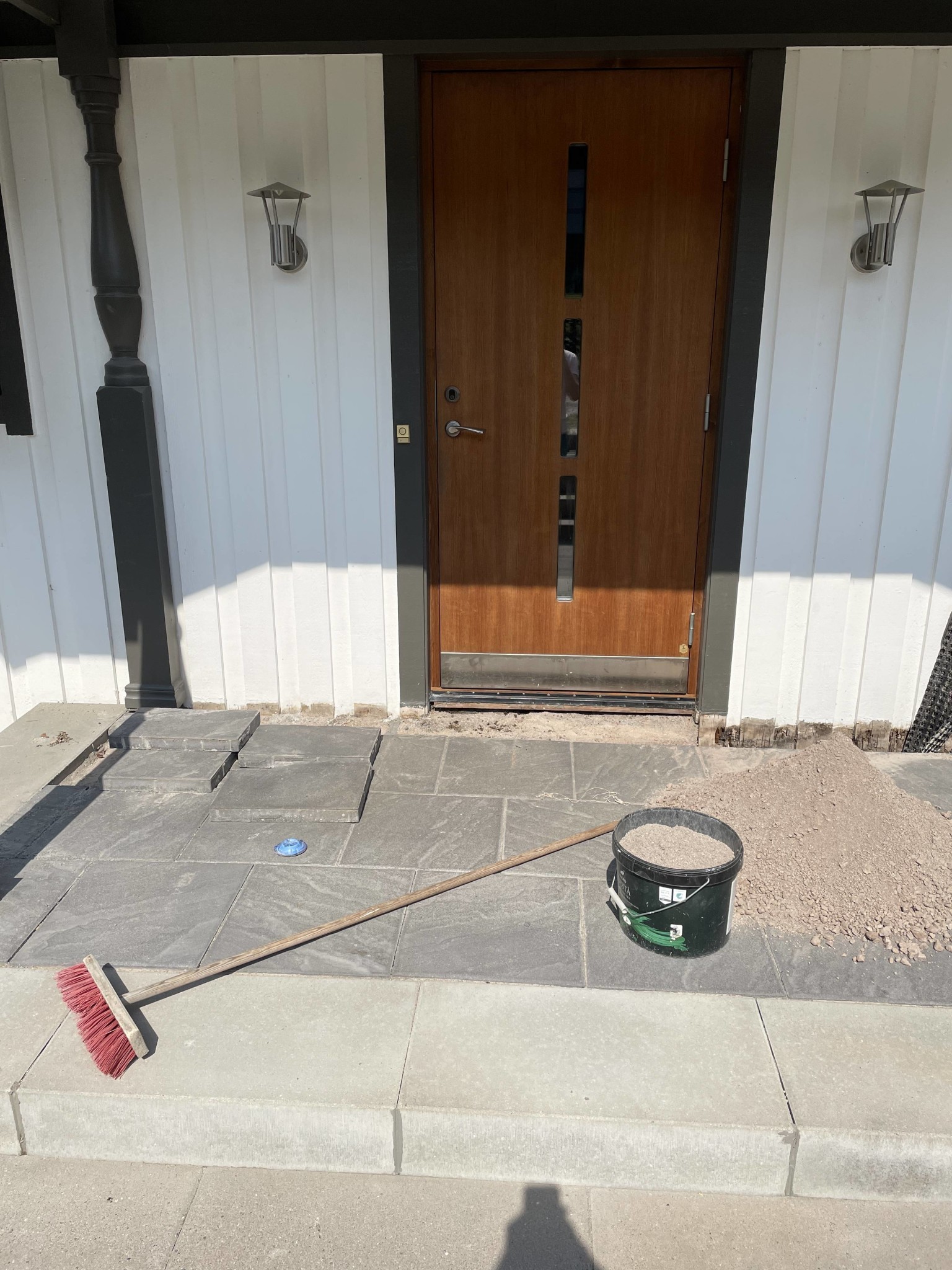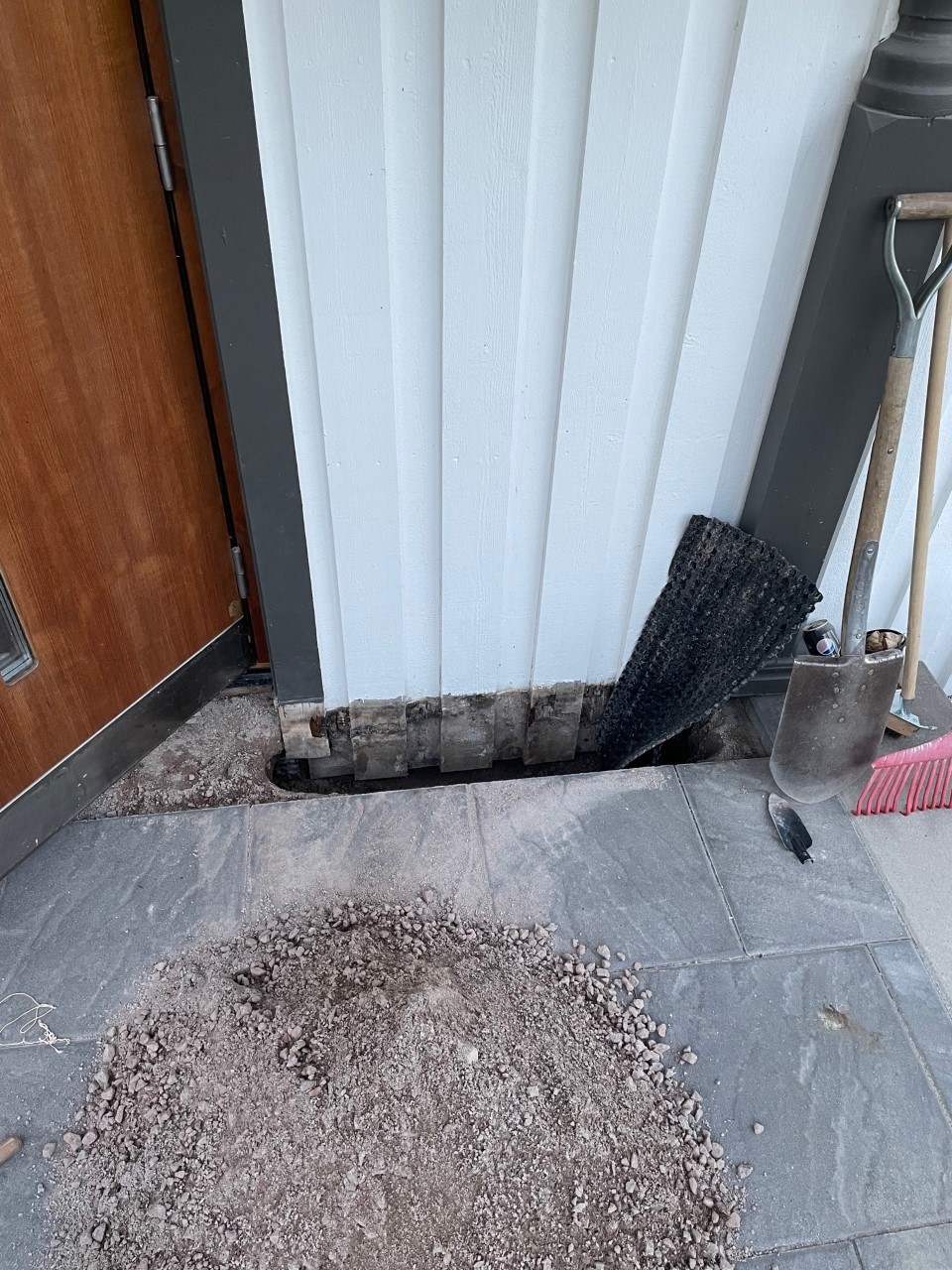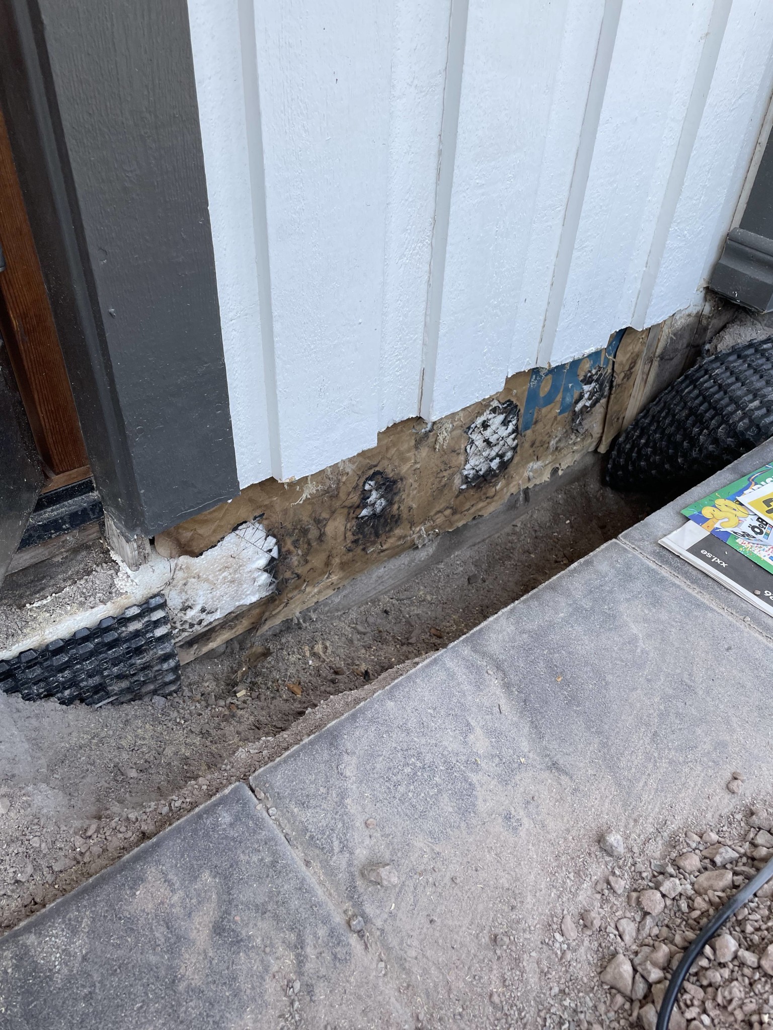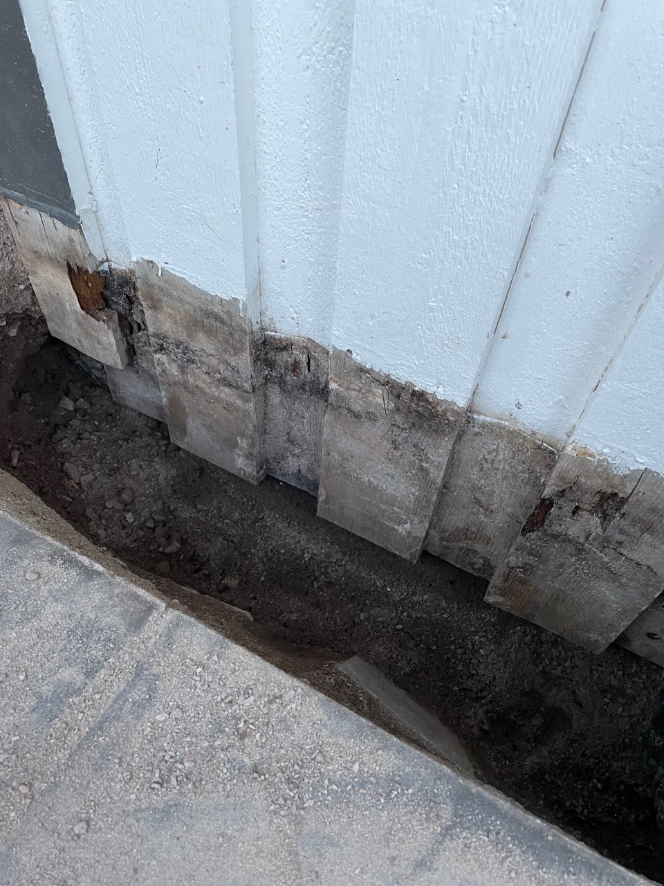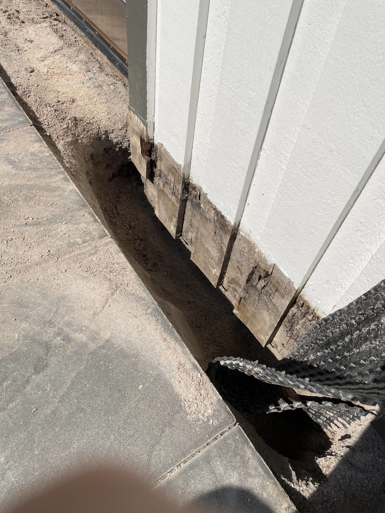 Skulle måla lite idag och märkte att det var lite ruttet. Funderar på o ta cirkelsåg o såga av precis vid marknivå av plattorna.