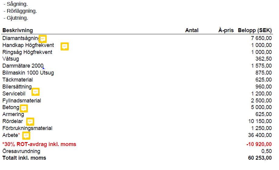 Och någon som kan bedöma om jag ska nöja mig med bifogade offerter eller leta vidare (på landet i Skaraborg (V:a Götaland)? Jag stör mig lite på materialkostnaderna men å andra sidan är arbetskostnaden ganska human (455kr+moms) så det är väl som diskuterats flera gånger tidigare på forumet - att rörmokare m.fl. gör ganska bra vinst på materialet. Svårt att bedöma offerten också då arbetet ska utföras på löpande räkning men offerten har stora klumpsummor där det är oklart hur mycket det kostar per timme, m2 osv. Jag har fått några svar vid telefonsamtal med dem. Jag känner förtroende för han som var här och tittade men är osäker på vad slutpriset kommer landa på.