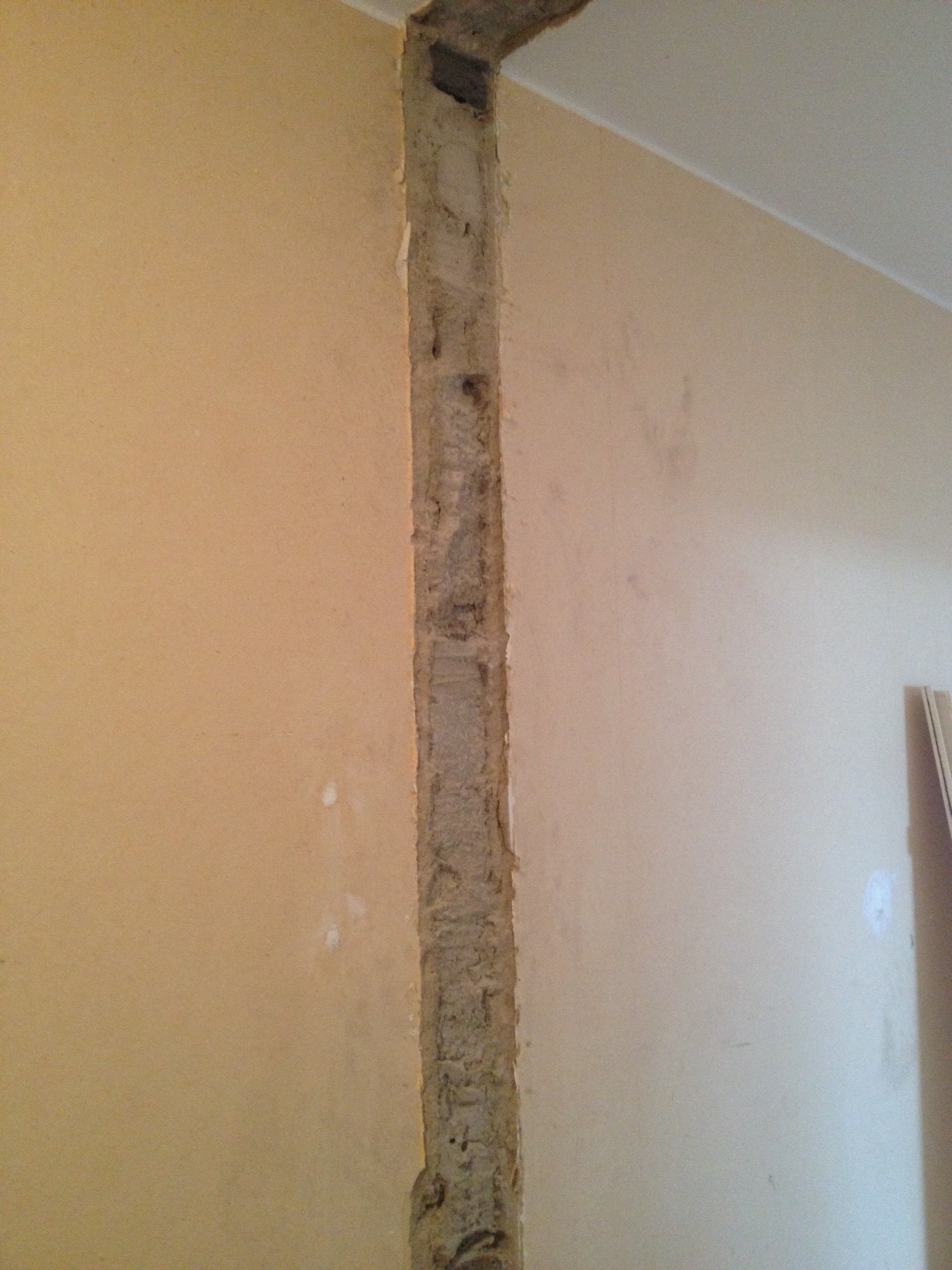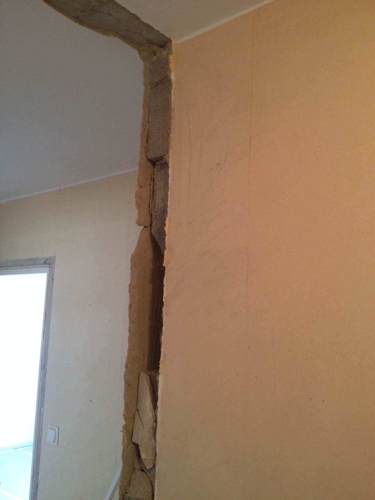 På andra sidan så såg det lättare ut, tills jag märkte att väggarna före/efter väggsnutten jag tog bort skiljer. Ca 1.5 cm höjdskillnad. Mejsla ut det bruk som sticker ut och försöka göra en fin övergång med spackel? Alt gipsskiva?