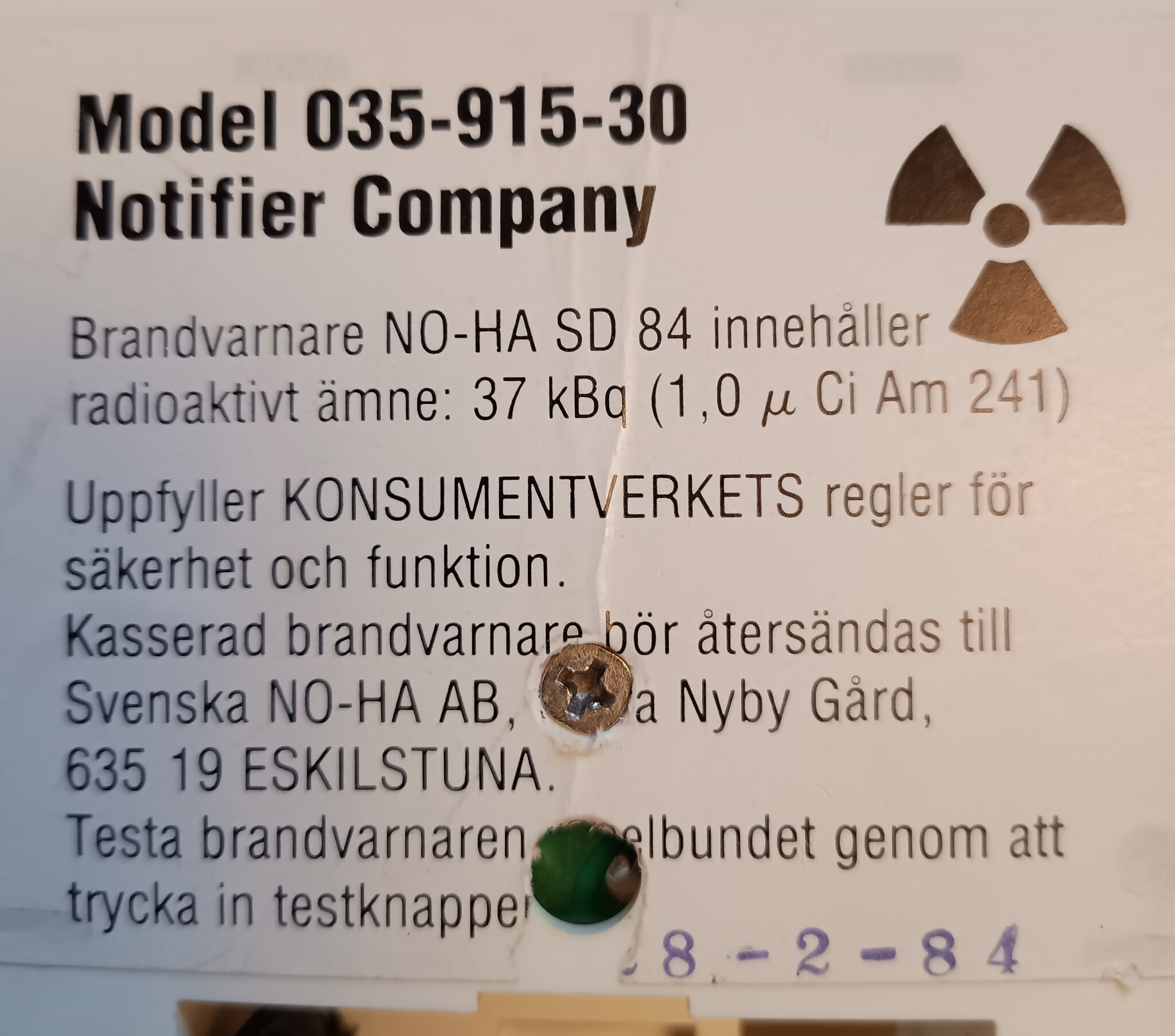 Det är väl bara att skicka den till adressen som står där?B Bitterhetsakademin skrev:Tidigare i år gav den upp efter fyrtio år i taket och är nu utbytt mot en modernare modell. På den tiden skulle kasserade brandvarnare återsändas för slutförvaring på grund av den svaga strålkällan. Efter Chernobyl togs det bort och det skrevs att batteriet skulle slängas i batteriåtervinningen och resten i hushållssoporna.