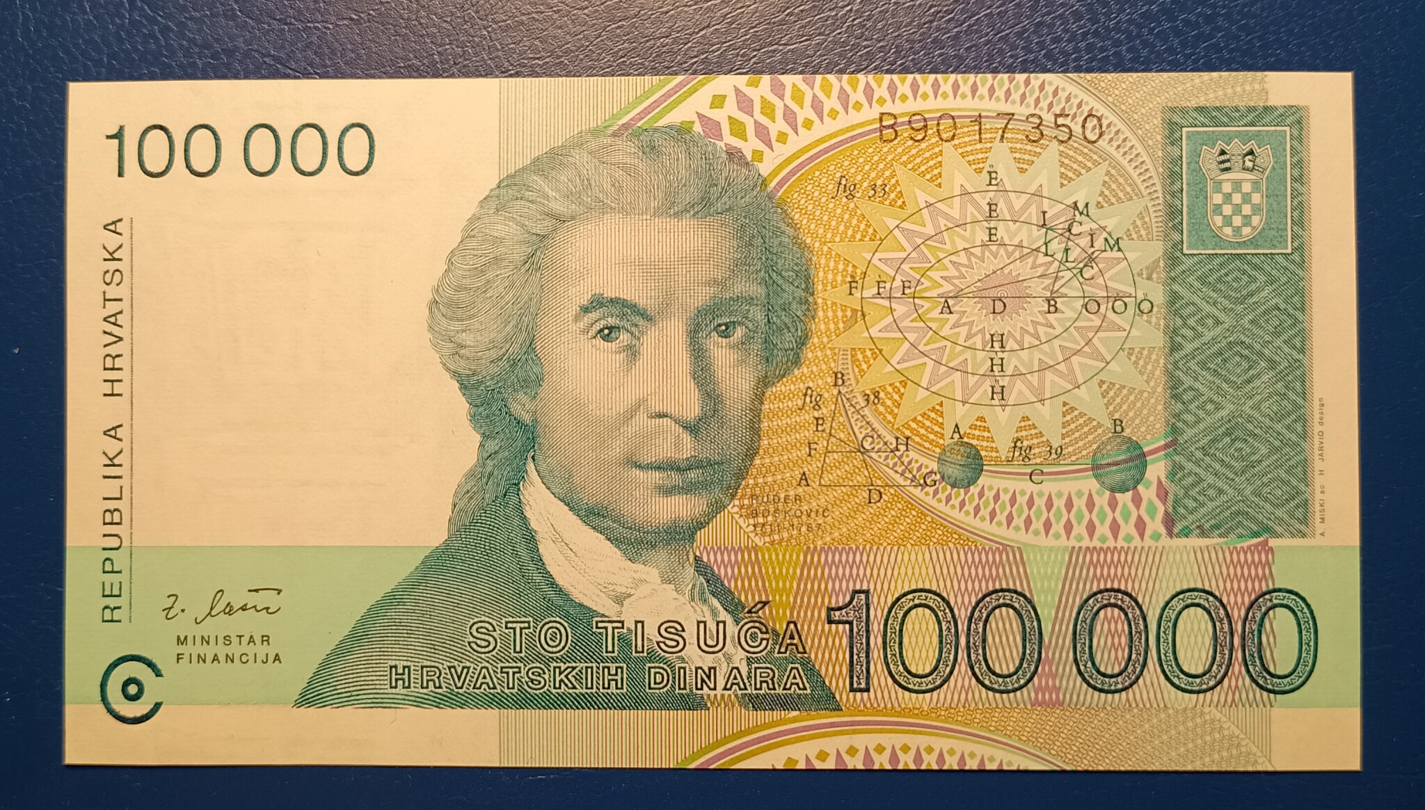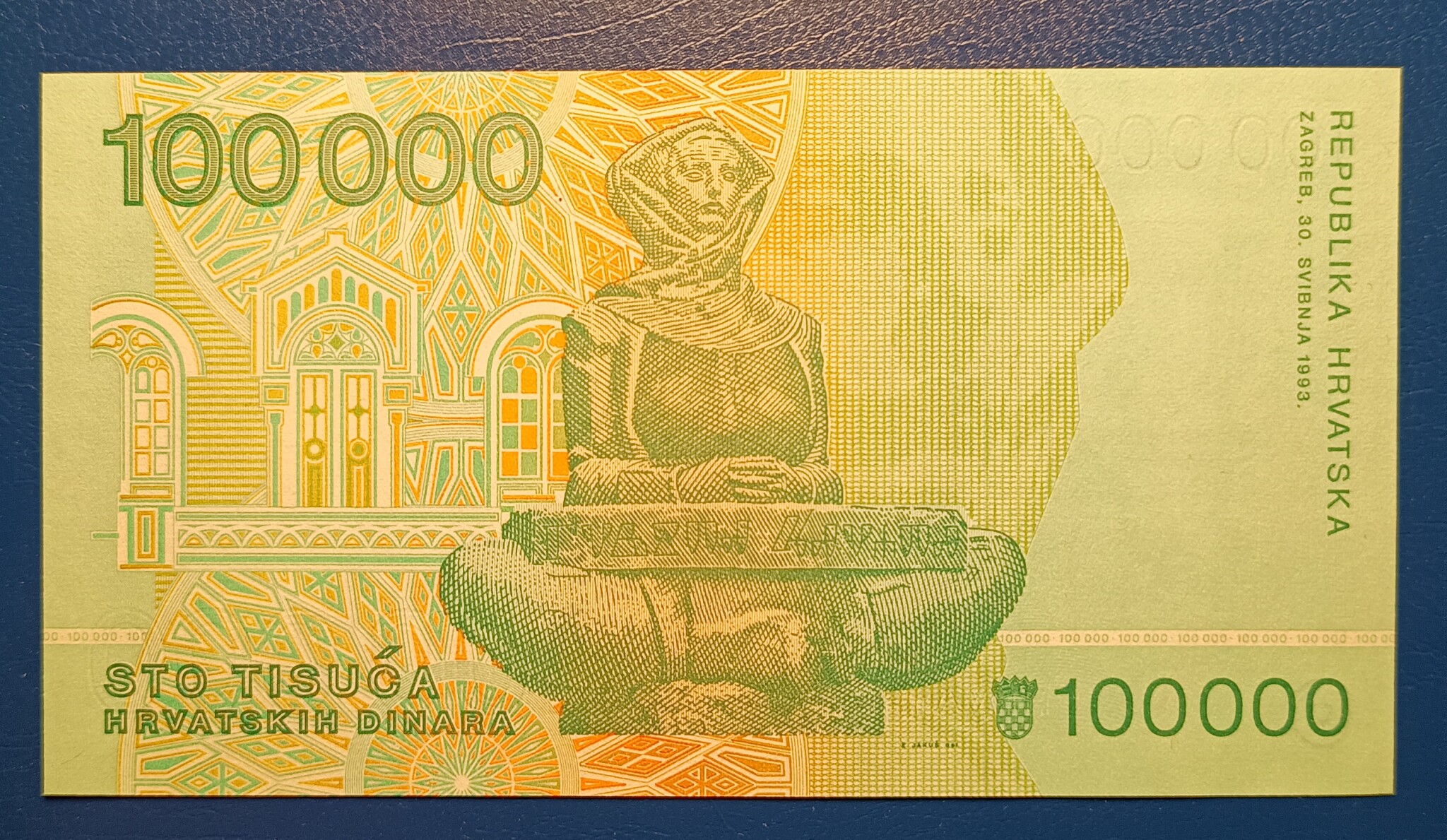 Här en hundratusendinarerssedel från Kroatien tryckt av Tumba bruk.