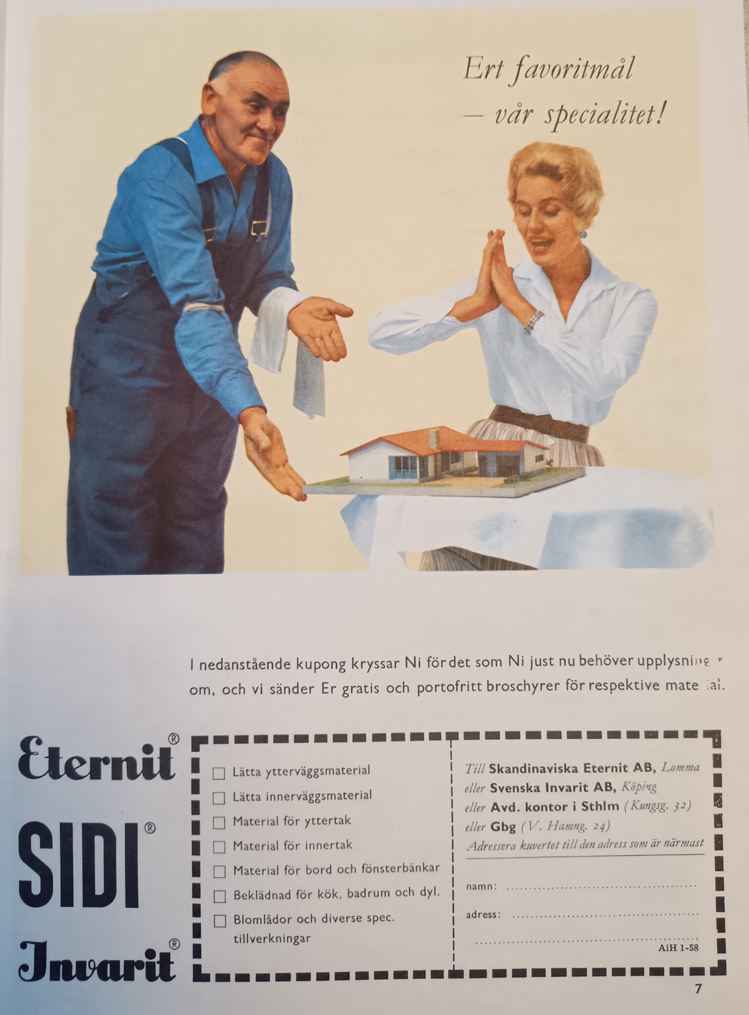 1958 var asbest framtidens byggmaterial. I USA byggdes ett utställningshus med allt i asbest, även tapeterna gardinerna och bordsduken med tillhörande servetter var av asbest.lars_stefan_axelsson skrev: