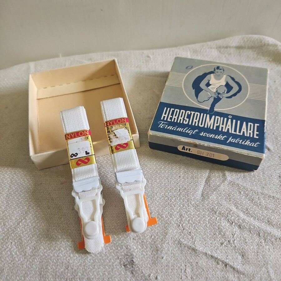 Herrstrumphållare! Fanns fram till cirka 60 -talet något. Strumporna var då av ylle eller bomull av låg stickningskvalitet. De halkade annars lätt ned.