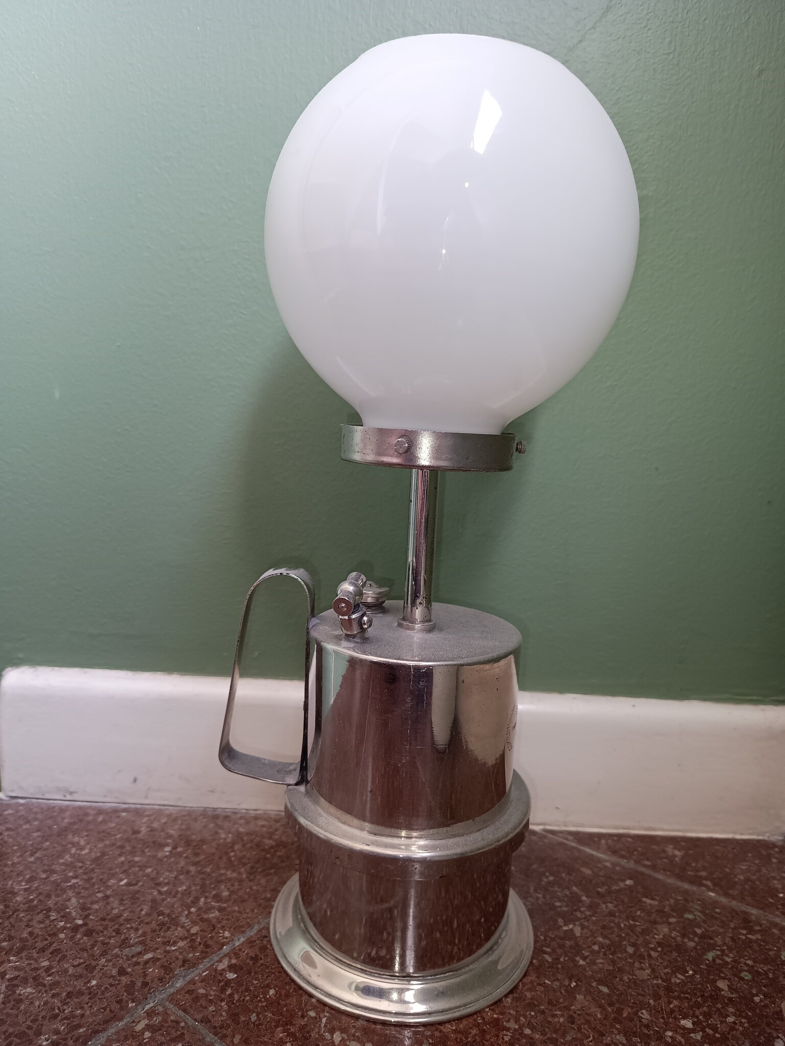 Nedre behållaren fylls med karbid och den övre med vatten. Sedan öppnas ventilen och vattnet droppar ner och reagerar med karbiden som utvecklar acetylengas. Användes som substitut för fotogenlampor under världskrigen då fotogen var en bristvara.