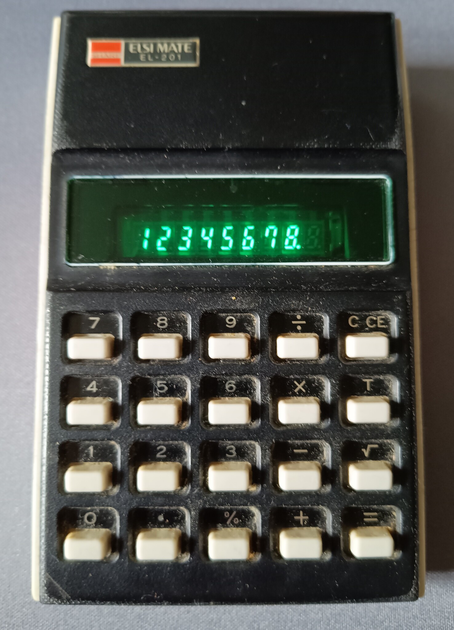 Farsan köpte en "miniräknare" i mitten på 70-talet, har för mig den hade grön display. Drevs på fyra R&-batterier, de gick åt fort så det blev en "batterieliminator", nätdel i väggklump i uttaget. Vill minnas att den hade lite lägre spänning än 6 V så siffrorna lyste lite svagare. Har för mig det var en Canon. Kan finnas kvar.