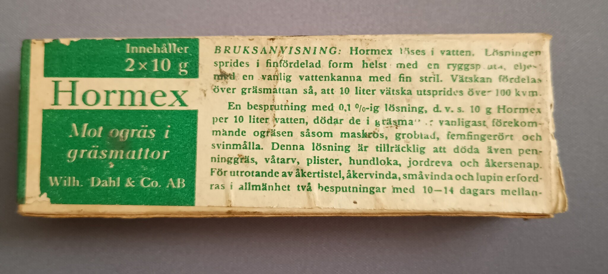 Ogräsmedel som verkligen fungerade. Hormex innehöll samma aktiva substans som Agent Orange och tog bort så gott som allt ogräs. Av miljöskäl och lathet är jag numera inte så noga utan gräsmattan får växa fritt, den behöver inte se ut som en golfgreen.
