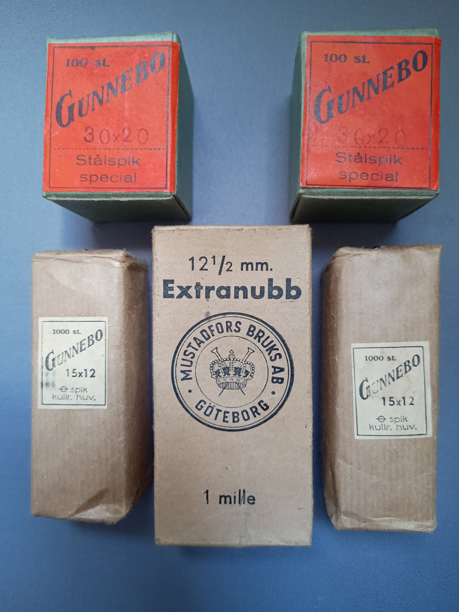 Äldre spik och nubb från Mustadsfors bruk grundat 1898 och Gunnebo grundat redan 1764.