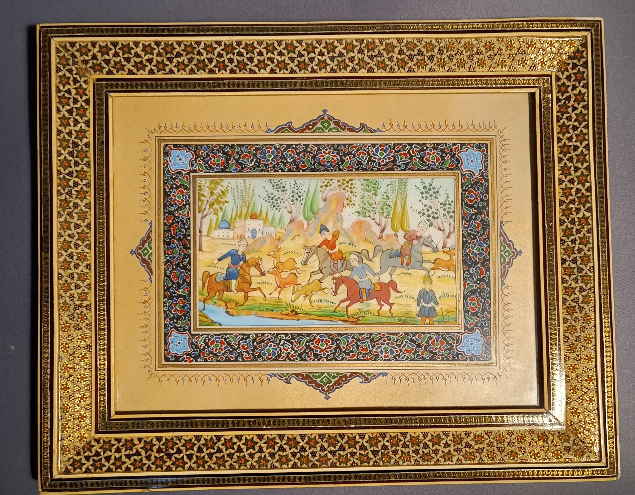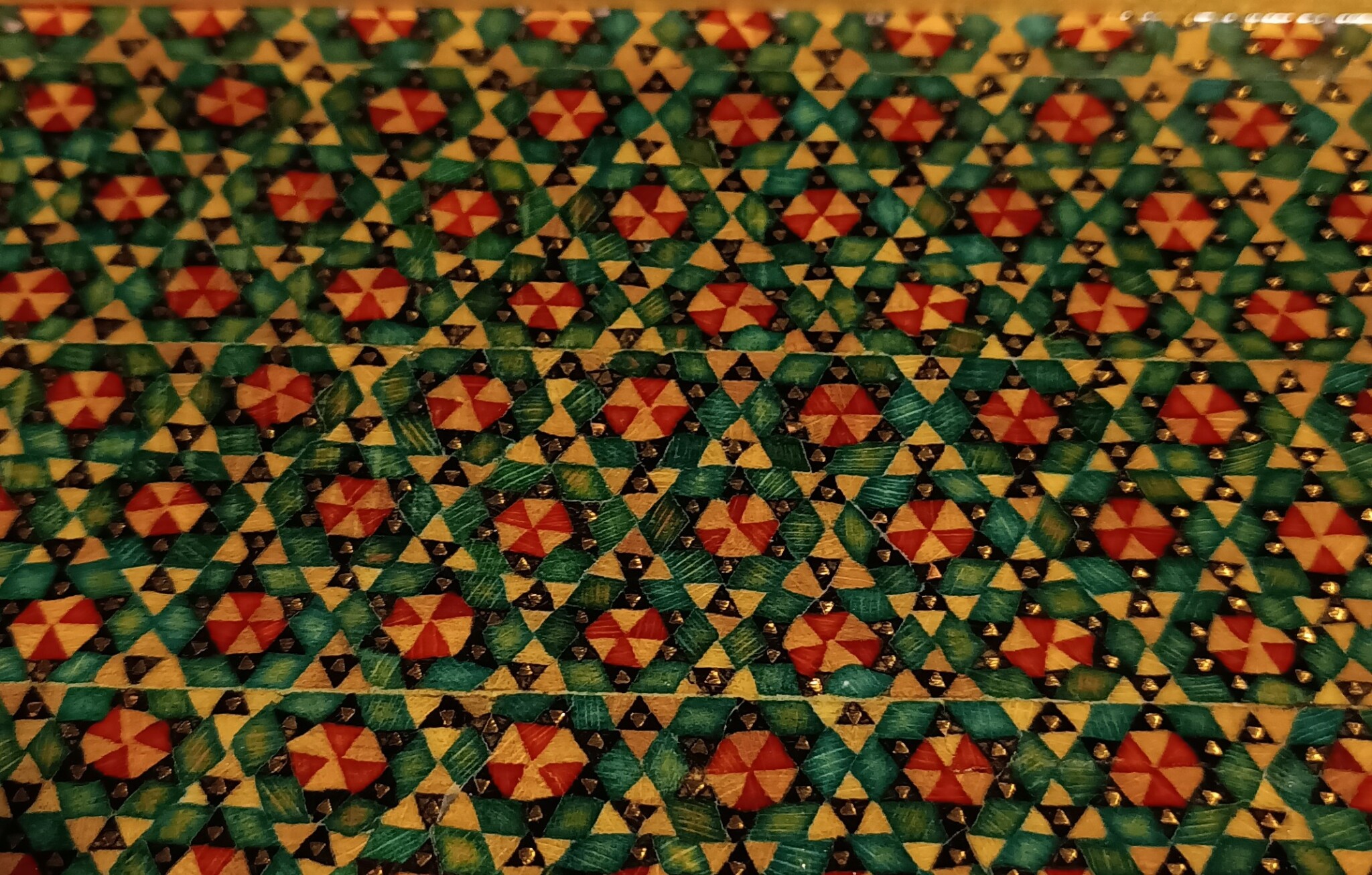 Den urgamla persiska tekniken för intarsia, Khatam-kari. Ett tidskrävande hantverk där små stavar av ben ädelträ och metall limmas ihop i intrikata geometriska mönster och sedan sågas i tunna skivor som poleras till högglans och därefter lackeras. Är populärt för minde askar och tavelramar samt andra prydnader.