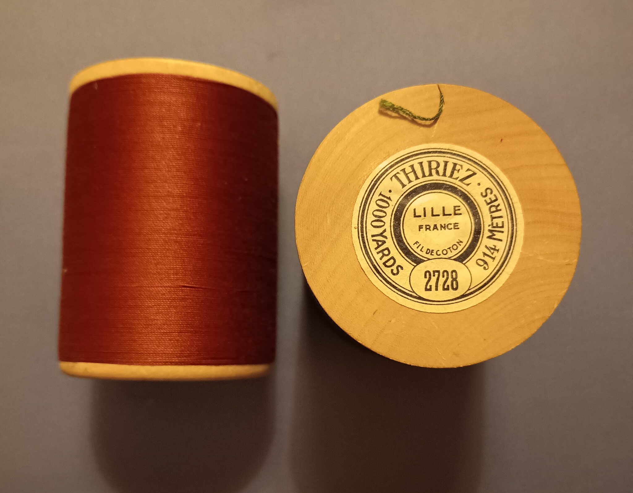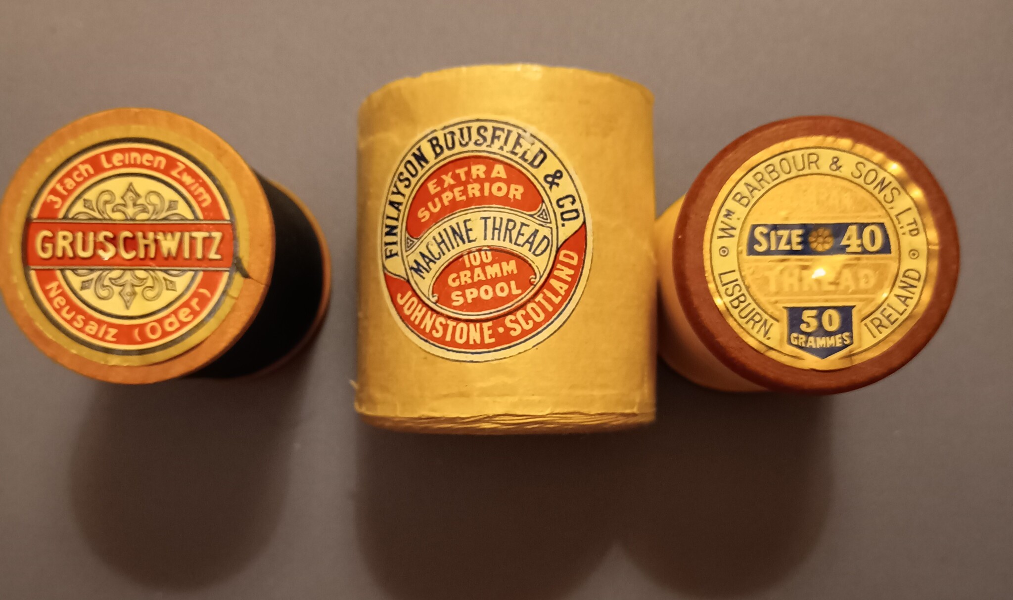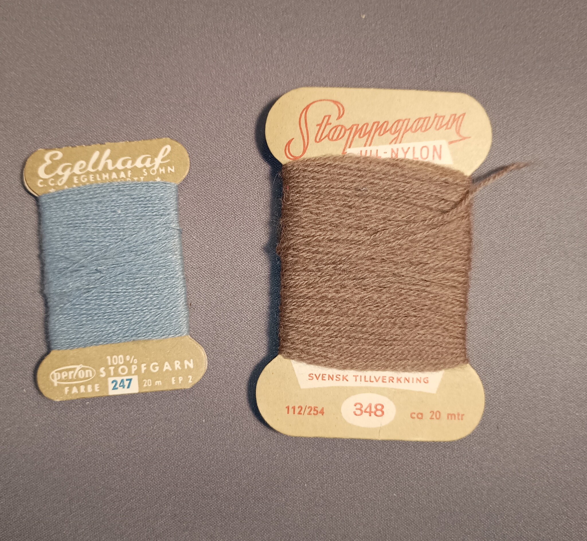 Äldre trådrullar i trä och stoppgarn i de då nya materialen nylon och perlon.