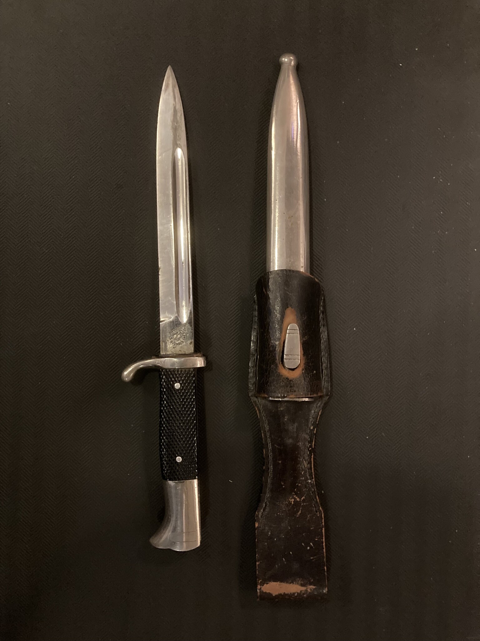 Men, det är ju tyskland vi talar om, och dessa hade ju inte accepterats av den tyska armens inspektörer så man var rädd att någon beväring skulle försöka använda sin prydnadsbajonett på sin Mauser m/98. Detta går ju inte an! Någon ordning måste det vara! Så man tillverkade dem alltså, med vett och vilja, så att spåret för låsklacken är för litet. *) Det går mao inte att knö på den här "bajonetten" på ett gevär, ens med den bästa vilja i världen. (Istället så fylldes spåret med en röd tassel; den är dock sedan länge borta på mitt exemplar.)
