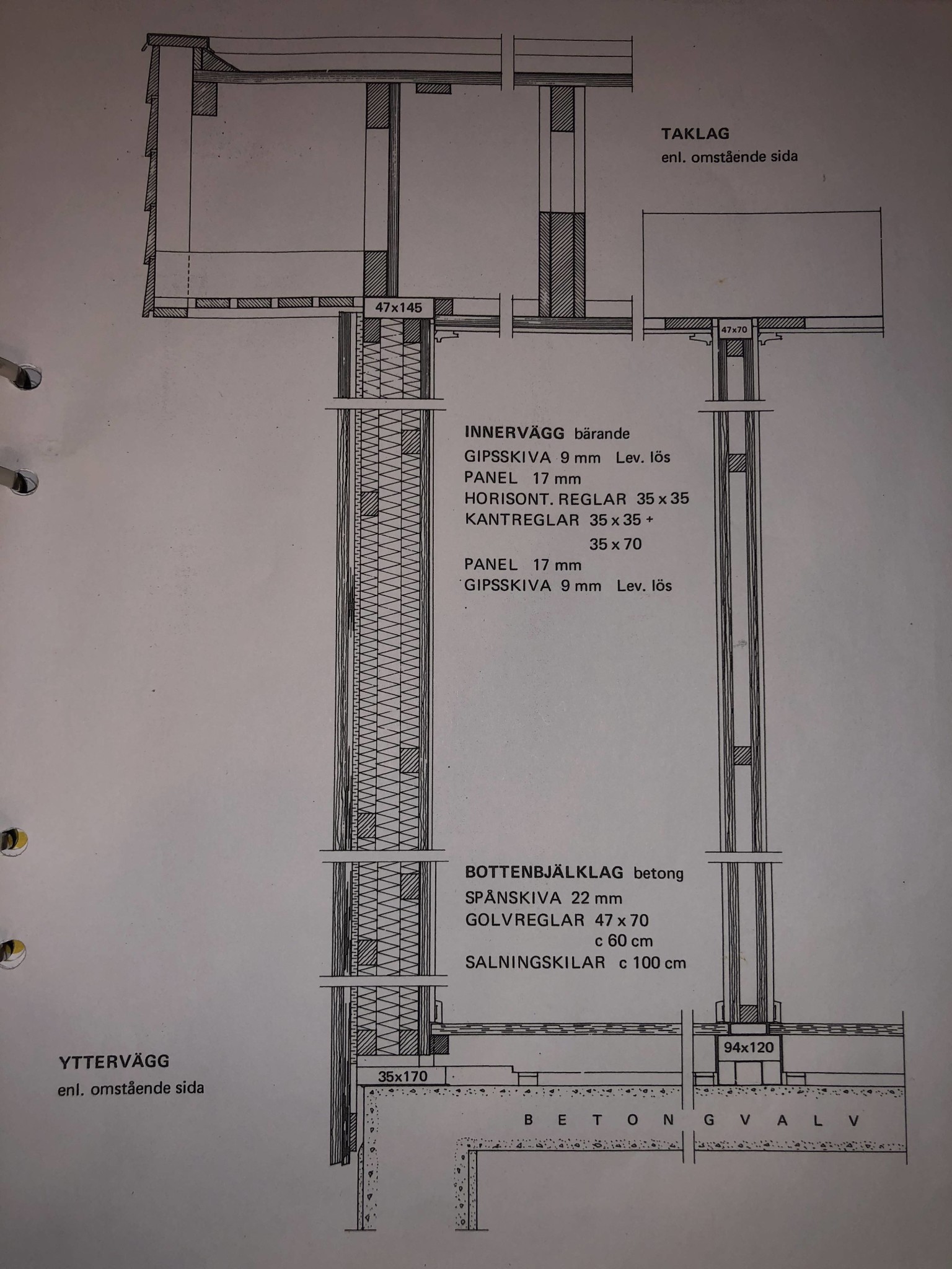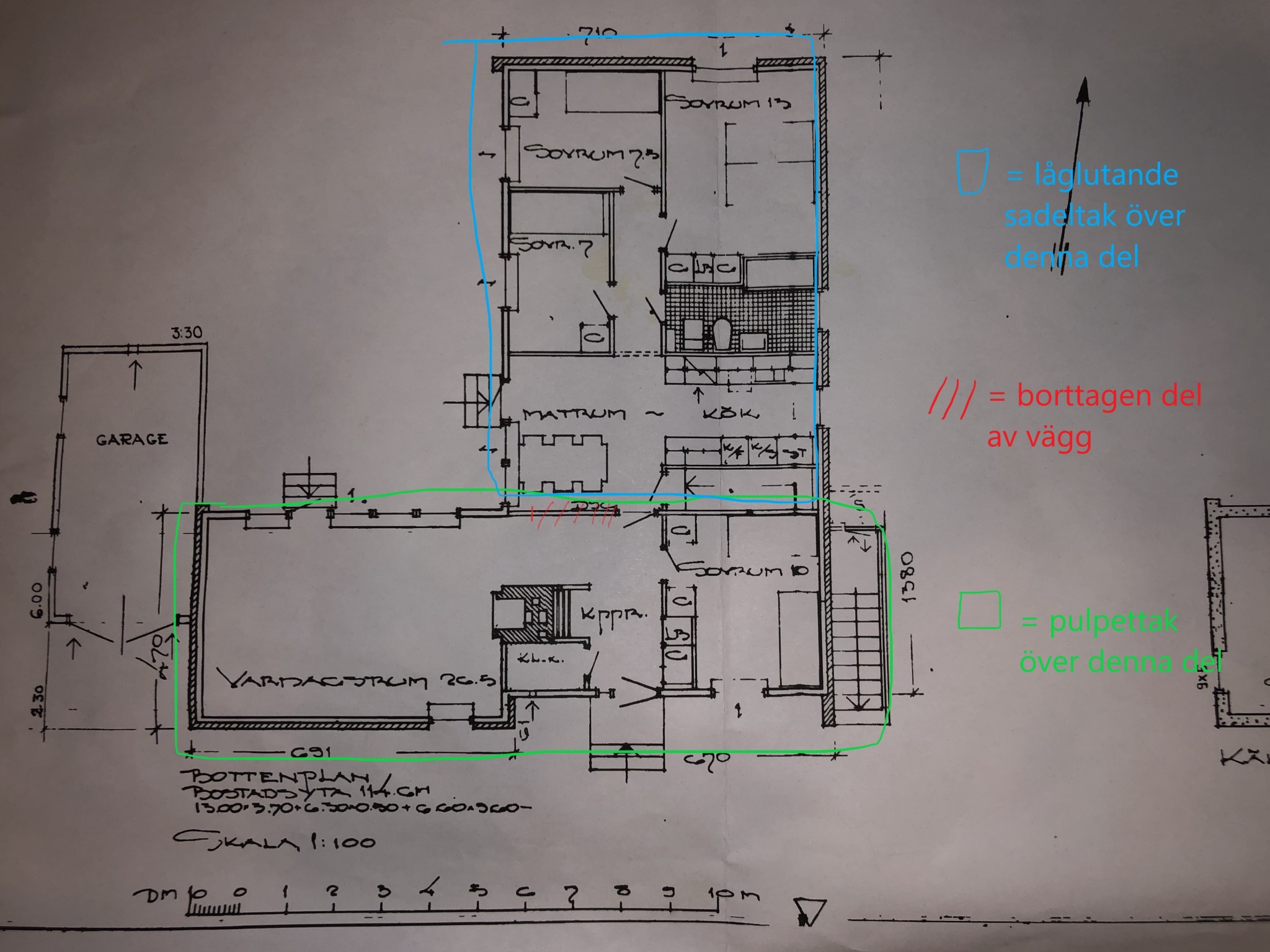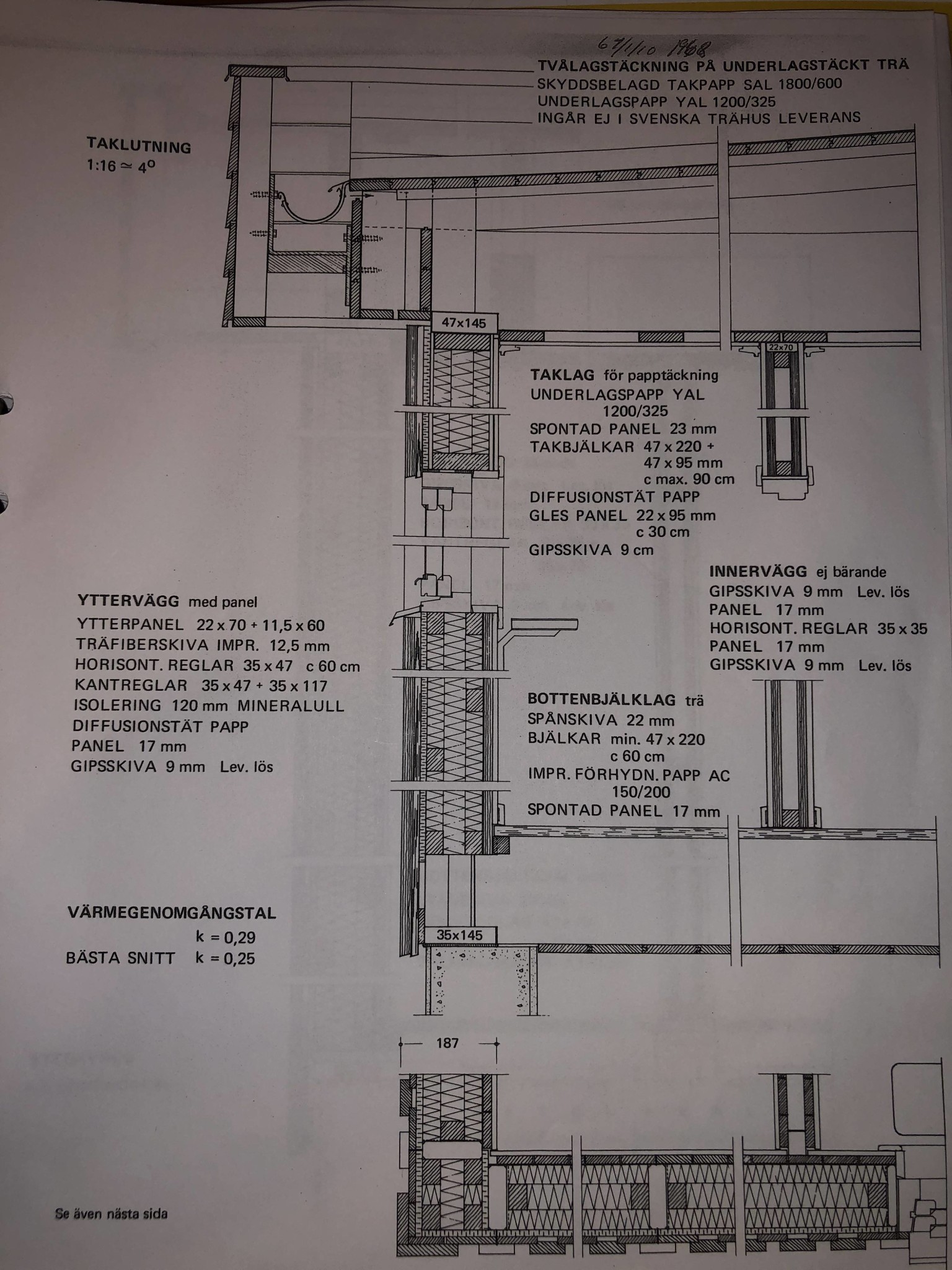 Avseende takkonstruktionen så har jag inte tänkt på det förr, men ritningen stämmer faktiskt inte med verkligheten där. Syns dåligt på bilderna från vinden men är uppenbart när man står på taket. Man verkar dock inte ha följt dessa ritningar alltför stringent i största allmänhet, då hela huset är roterat 90 grader på tomten jämfört med dessa och garaget placerat vid sovrumsdelens kortsida istället...