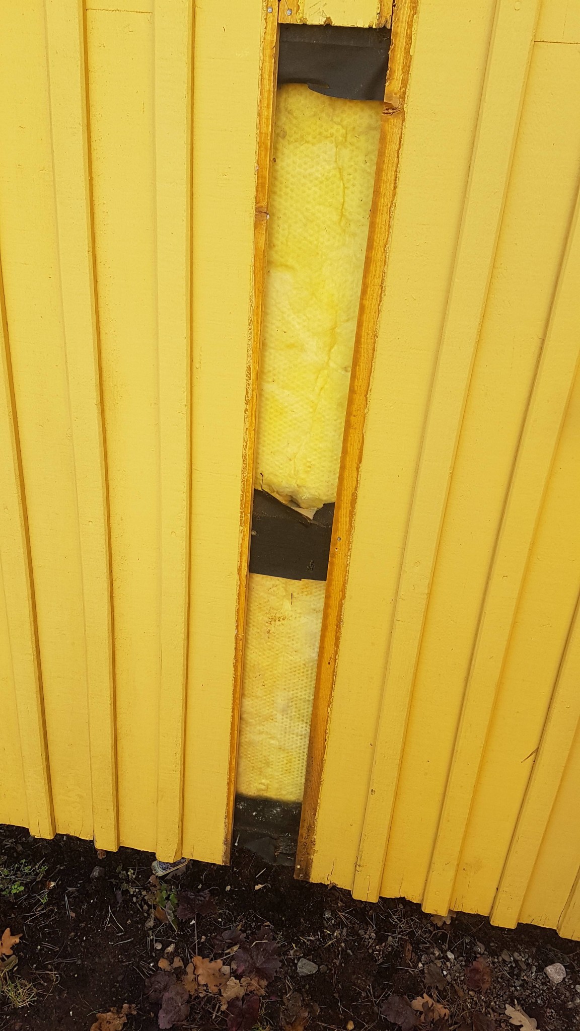 Jag tog bort en bräda igår för att kolla lite hur väggen är byggd idag och upptäckte att det inte finns någon vidare luftspalt (eller vindpapp för den delen). Det finns en spikläkt på 38 mm som panelen sitter i men det är mineralull i princip ända ut till panelen. Detta stämmer mot original-byggbeskrivningen som jag hittade för huset, där det står att väggarna på garaget består av (utifrån och in) 22 mm panel med lockläkt, 38 mm spikregel, 70 mm regelstomme, 70 mm mineralull + 30 minull, 0.1 plastfolie, 13 mm gipsskiva. Brädan jag tog bort var inte vid en regel så jag har inte sett hur spikläkten sitter placerad mot regeln, men jag utgår från att den sitter spikad utanpå för att få plats med isoleringen. Är detta en felaktig gissning, kan "spikregeln" sitta placerad "mellan" regelstommen?
