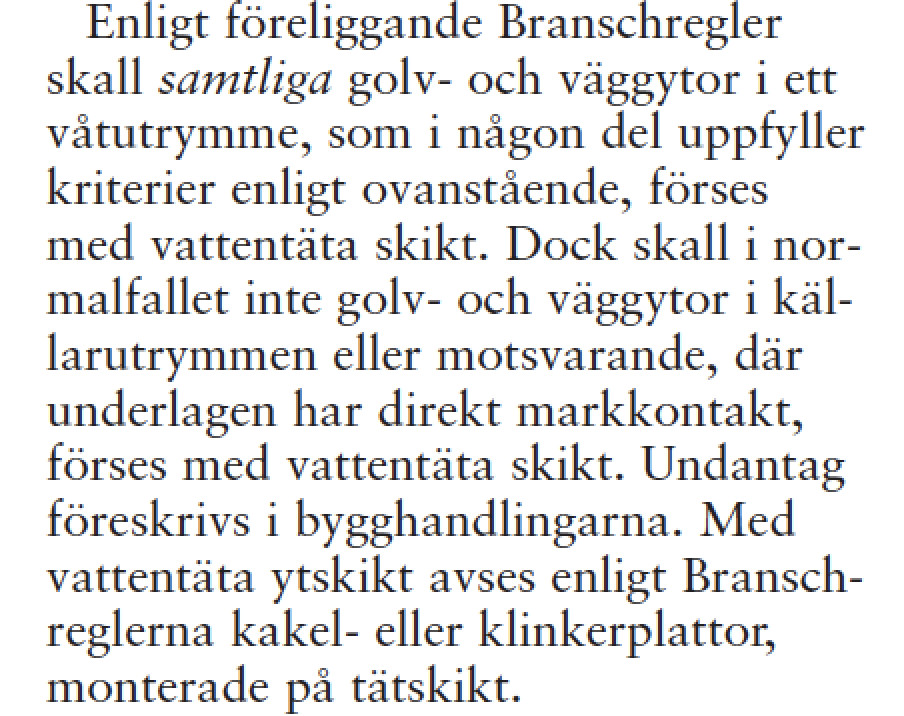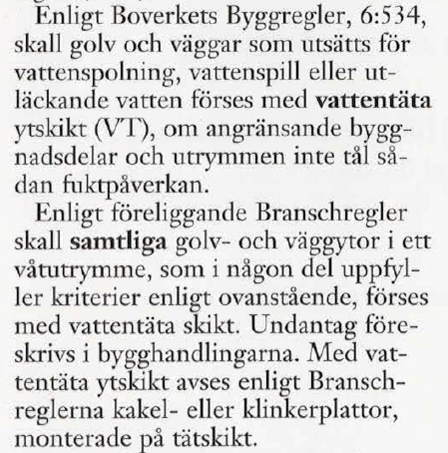 Nu kollade jag. Det är först i BKRs utgåva 1999 som det för första gången uttryckligen sägs att underlag med direkt markkontakt inte ska förses med vattentäta skikt. Men detta är alltså ett par år efter TS dusch renoverades. Om jag förstår det rätt skulle det vara tätskikt i duschen enligt BKRs regler när det renoverades enligt BKRs regler från 1996. Men kravet fanns så inte i BBR.