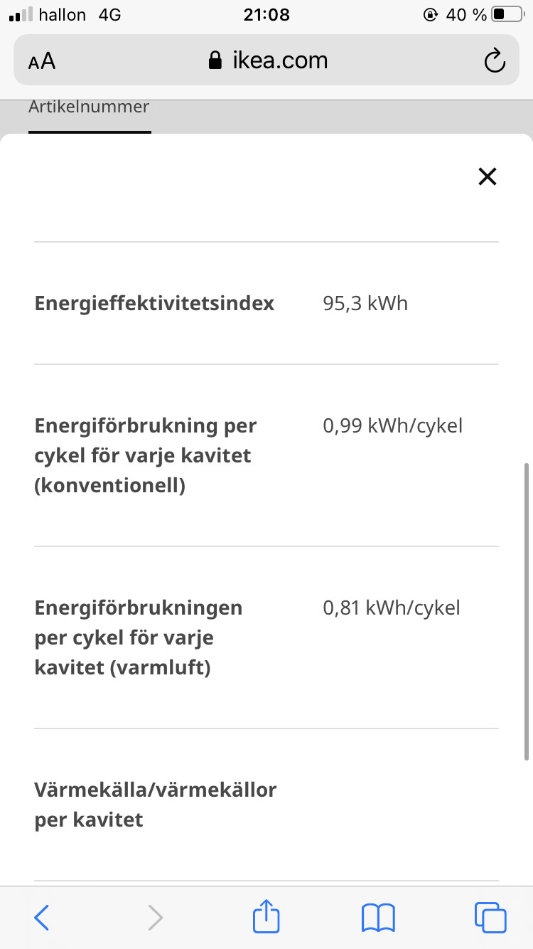 elektrikern som var där i början på renoveringen sa att inget annat var inkopplat på den säkringen, men jag har läst på IKEA för att få redan på hur många watt ugnen drar men inte hittat det, bara kw info som inte säger mig någotH Harald Blåtumme skrev:Bilden på din anslutningskontakt visar att det är en enfas-inkoppling med förmodat hög strömstyrka som krävs för din ugn, kontakten är i alla fall dimensionerad för mer än 16A.