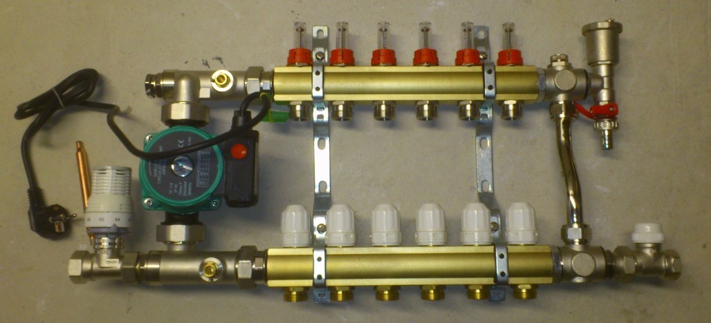 Nya golvvärmeshuntar med fördelare. Har 2 st en för 6 slingor och en för 5 slingor. Kompletta med termostat, flödesmätare, bypass, avluftare o termometrar (termometrar ej monterade på bilden)