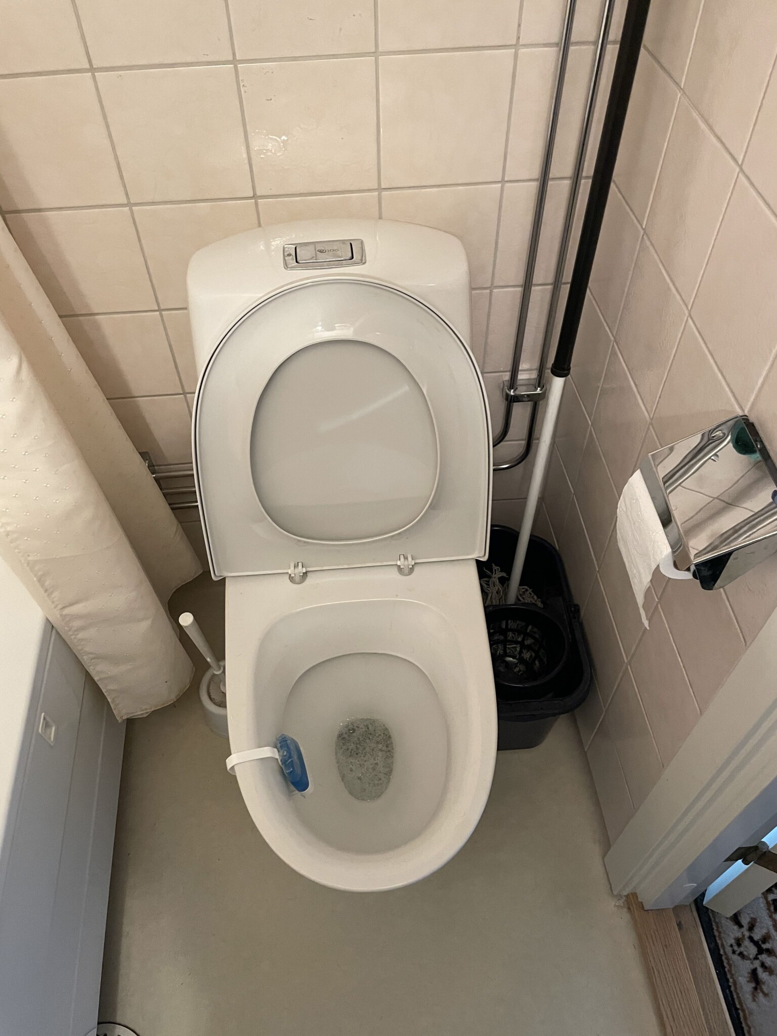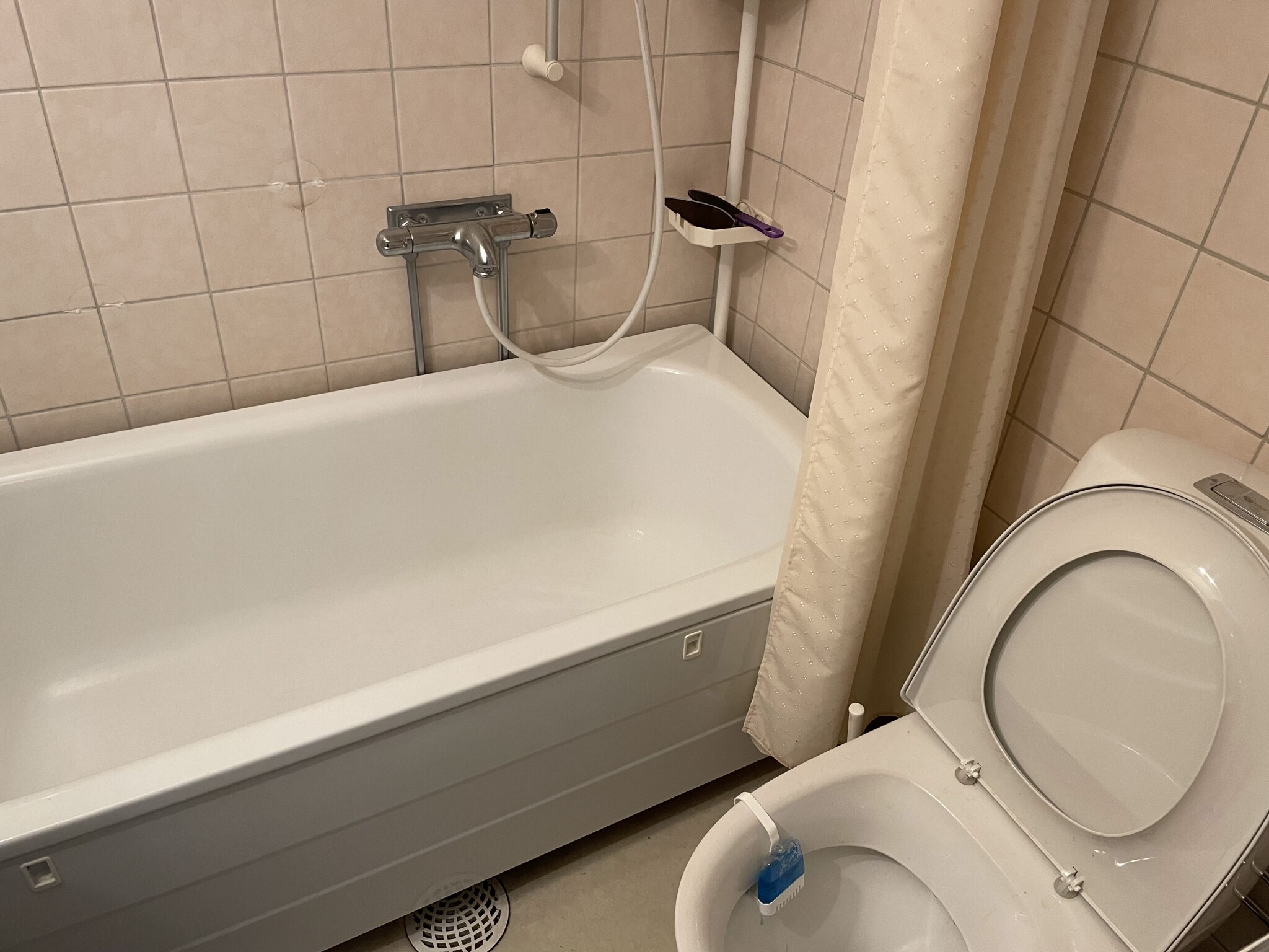 Det finns ingen kontakt i badrumet, bortsett från en kontakt som sitter i badrumsskåpet, som är tänk att användas för exempelvis eltandborste eller rakapparat.