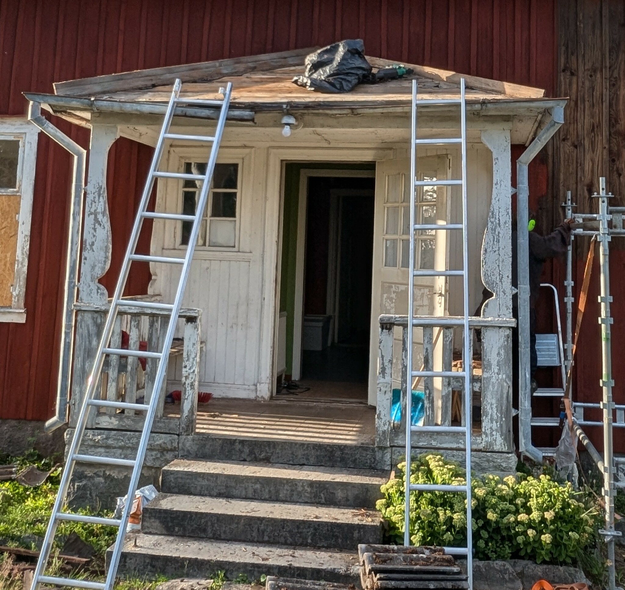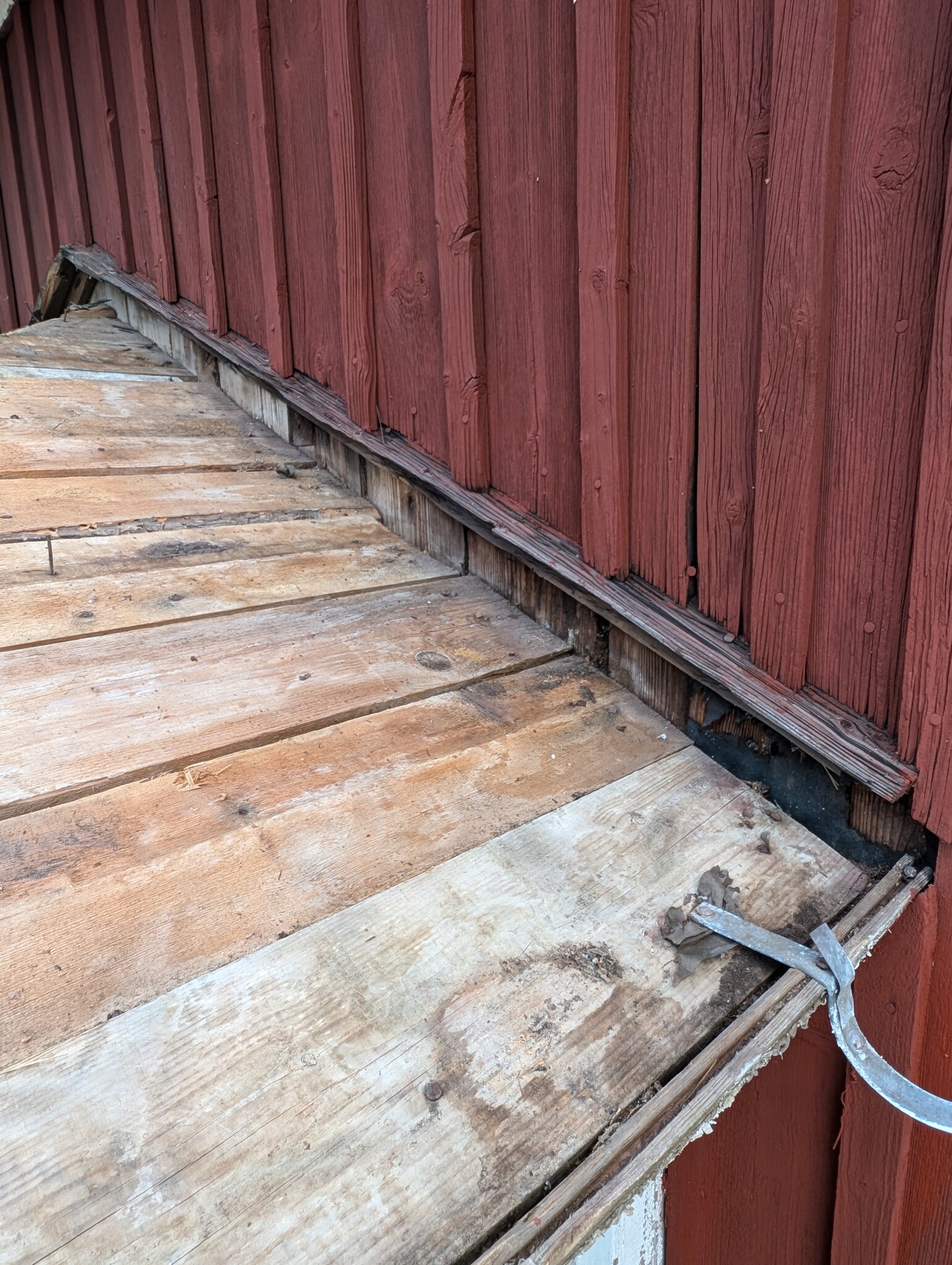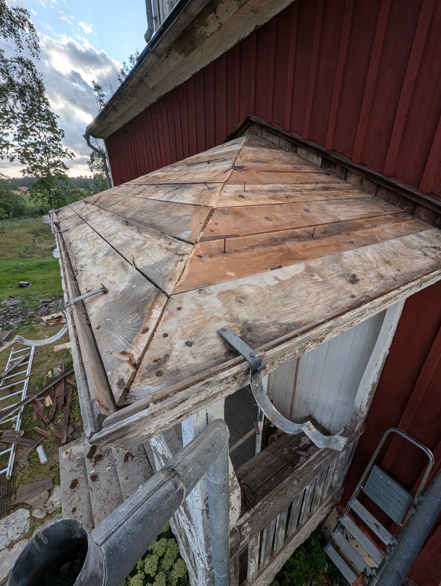 1) Hur hade ni gjort med mötet mot väggen? Jag tänker mig att jag river den gamla trasiga vattbrädan, och alla ribbor. Och den spruckna brädan förstås. 😉 Sen sätter jag en liggande entummare under där panelen slutar så att mötet mellan tak och vägg blir i liv. Underlagspappen viker jag upp en bit på den rödmålade väggen antar jag och nitar fast.