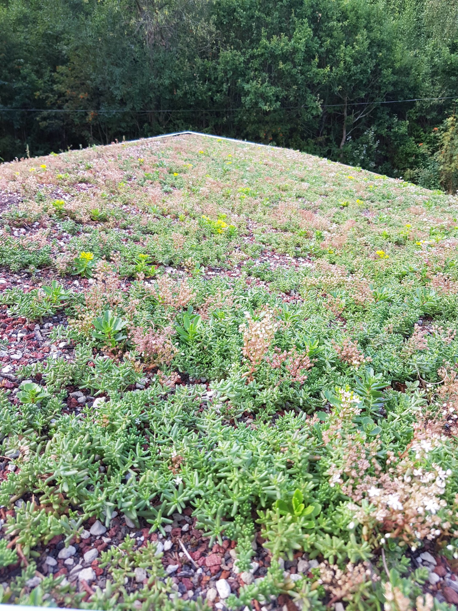 Jag la underlagspapp på råsponten, sedan en epdm-gummiduk. Därpå en fukthållande matta, sedan avsedd "jord" och sedumskott. Efter 2 månader är uppskattningsvis 70% v taket täckt av blommande sedumväxter.