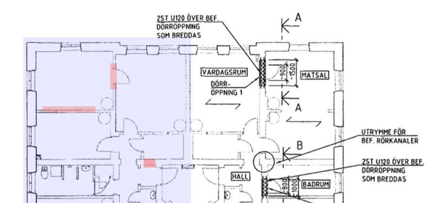 Jag har en vägg mellan kök och vardagsrum som jag önskar öppna upp till ett kvadratiskt valv. Väggen finns mellan kakelugnarna. Märk också att grannen har tagit bort sin vägg utan avväxling. Se bild på den finishöppnade väggen och grannens öppning.