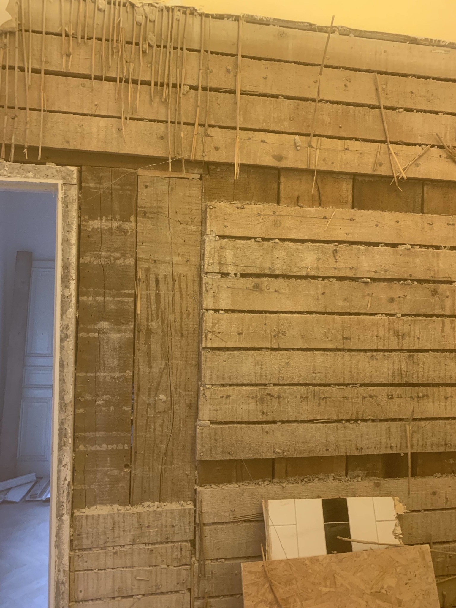 • Avtäckt vägg med synliga träreglar och en öppning till ett annat rum, möjlig bärande konstruktion.