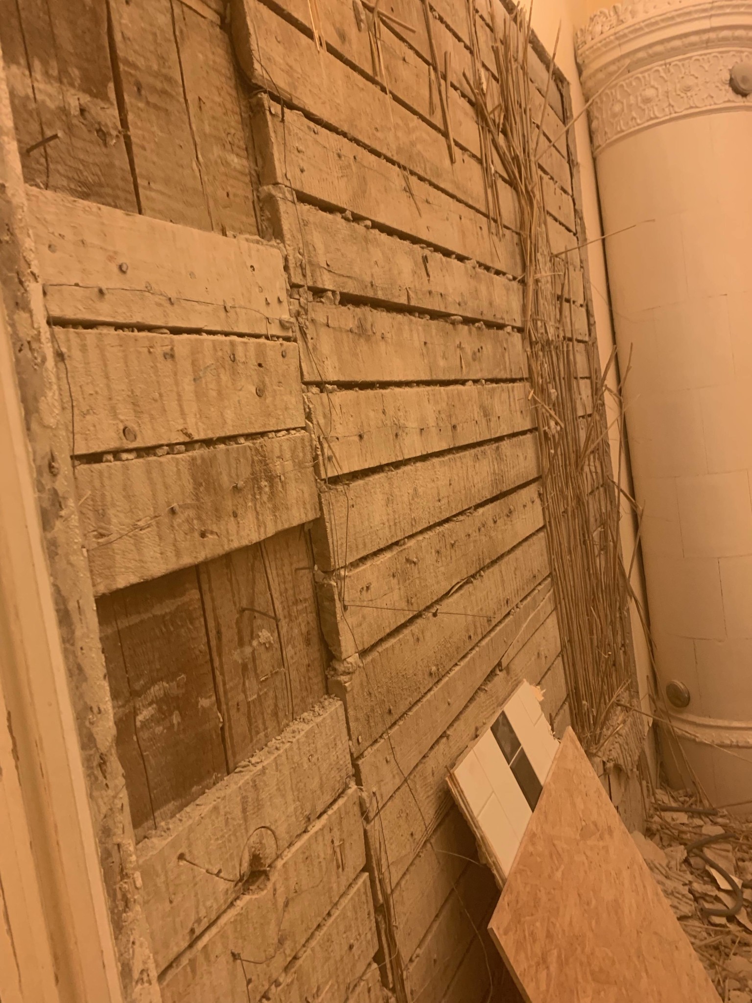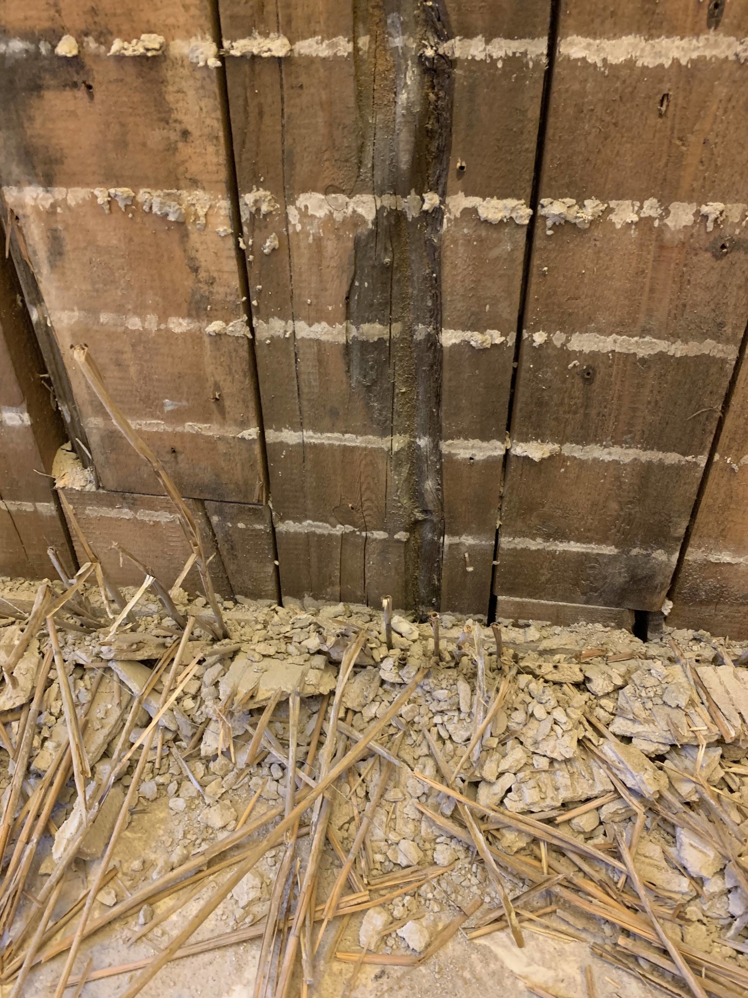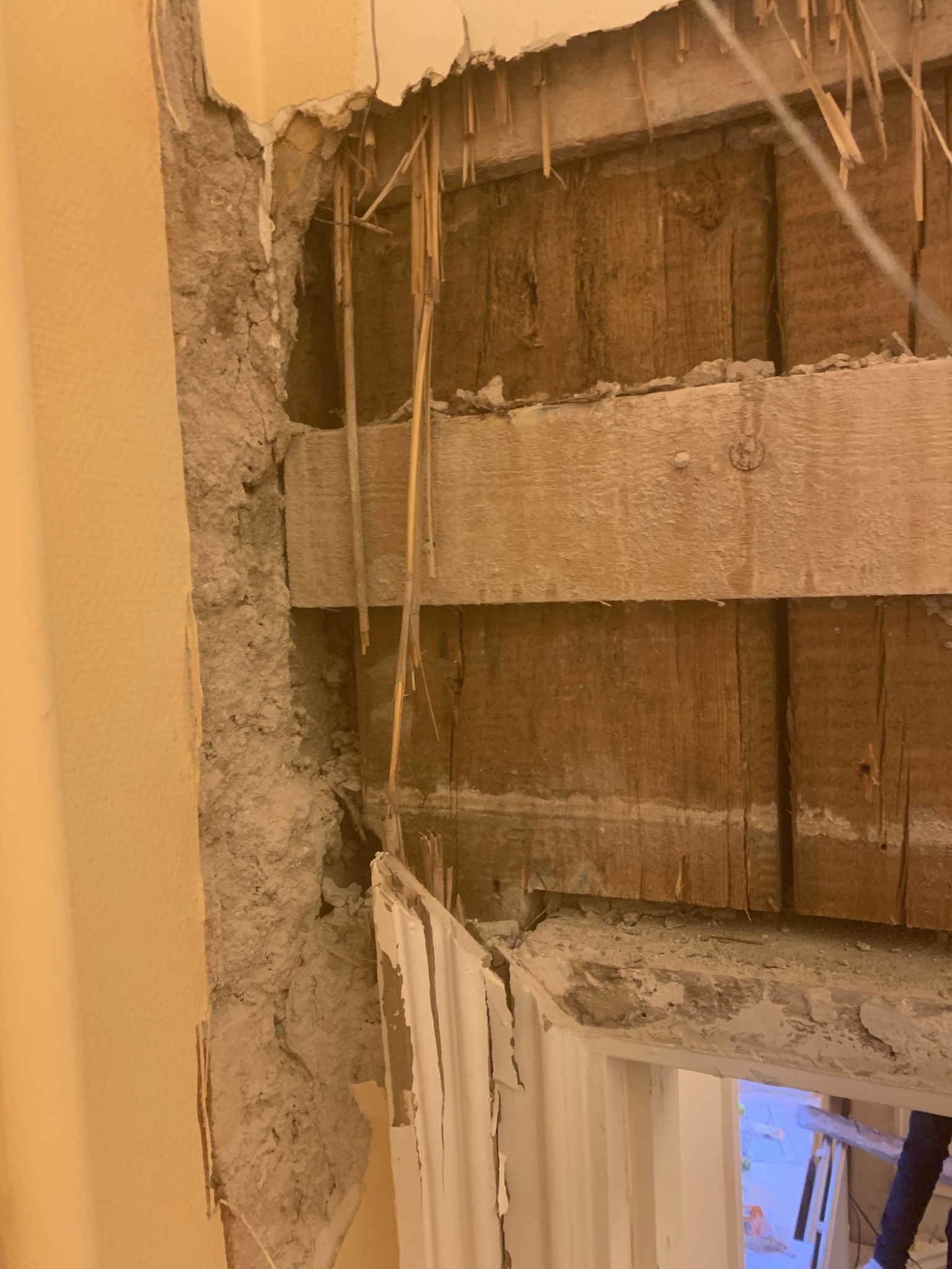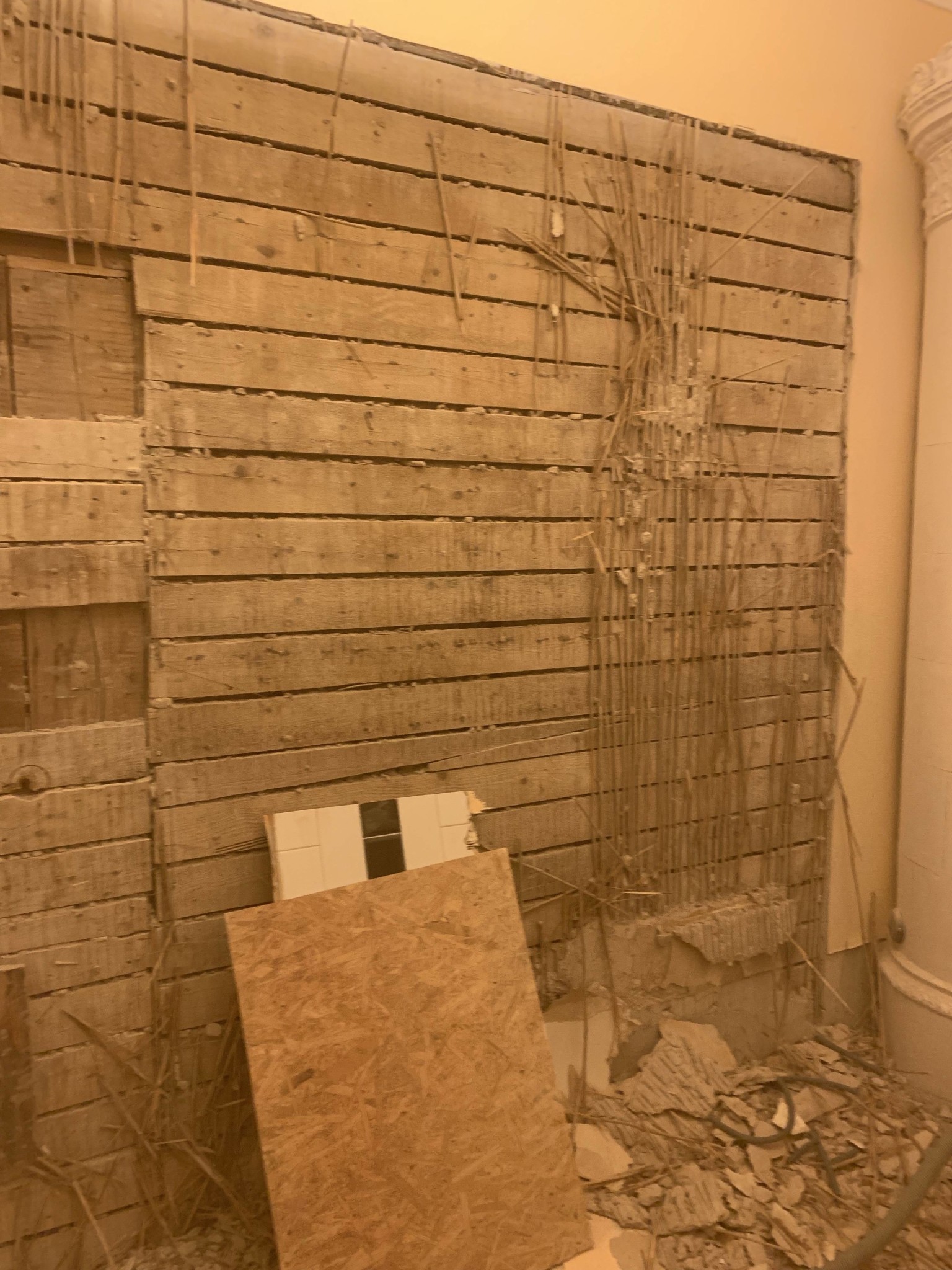 • Söndertagen gipsvägg som avslöjar trästommar och splittrad gips och isolering på golvet.