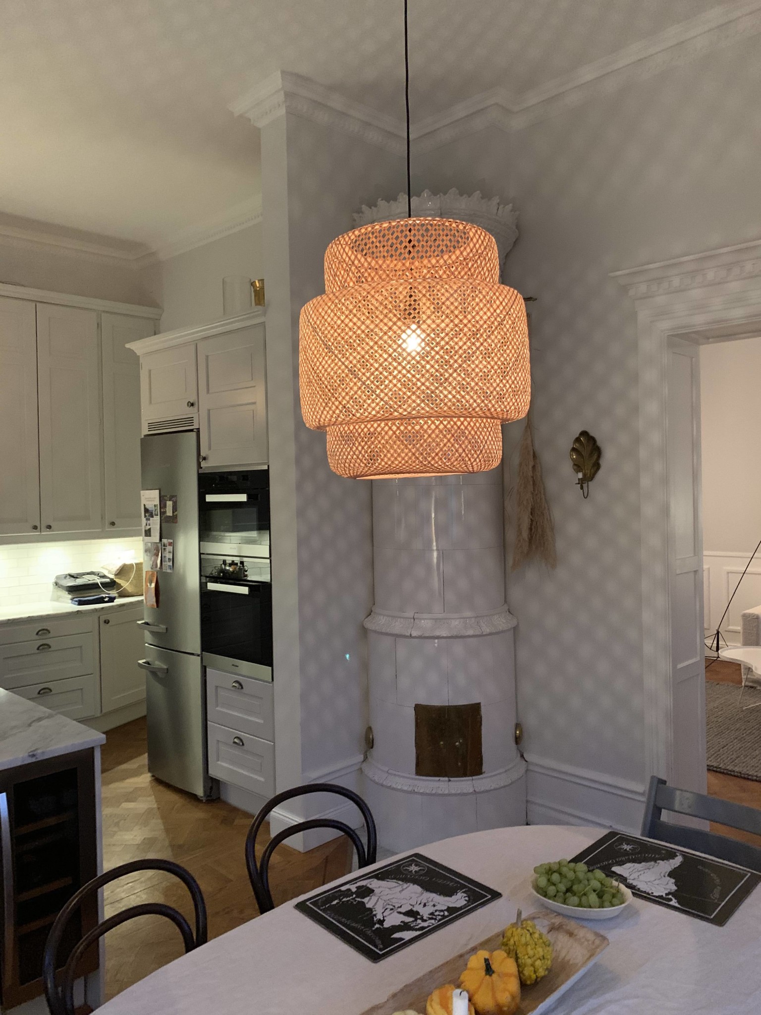 • Kök och vardagsrum delas av en vägg med en kakelugn, troligen bärande, med diskussion om att skapa kvadratiskt valv.