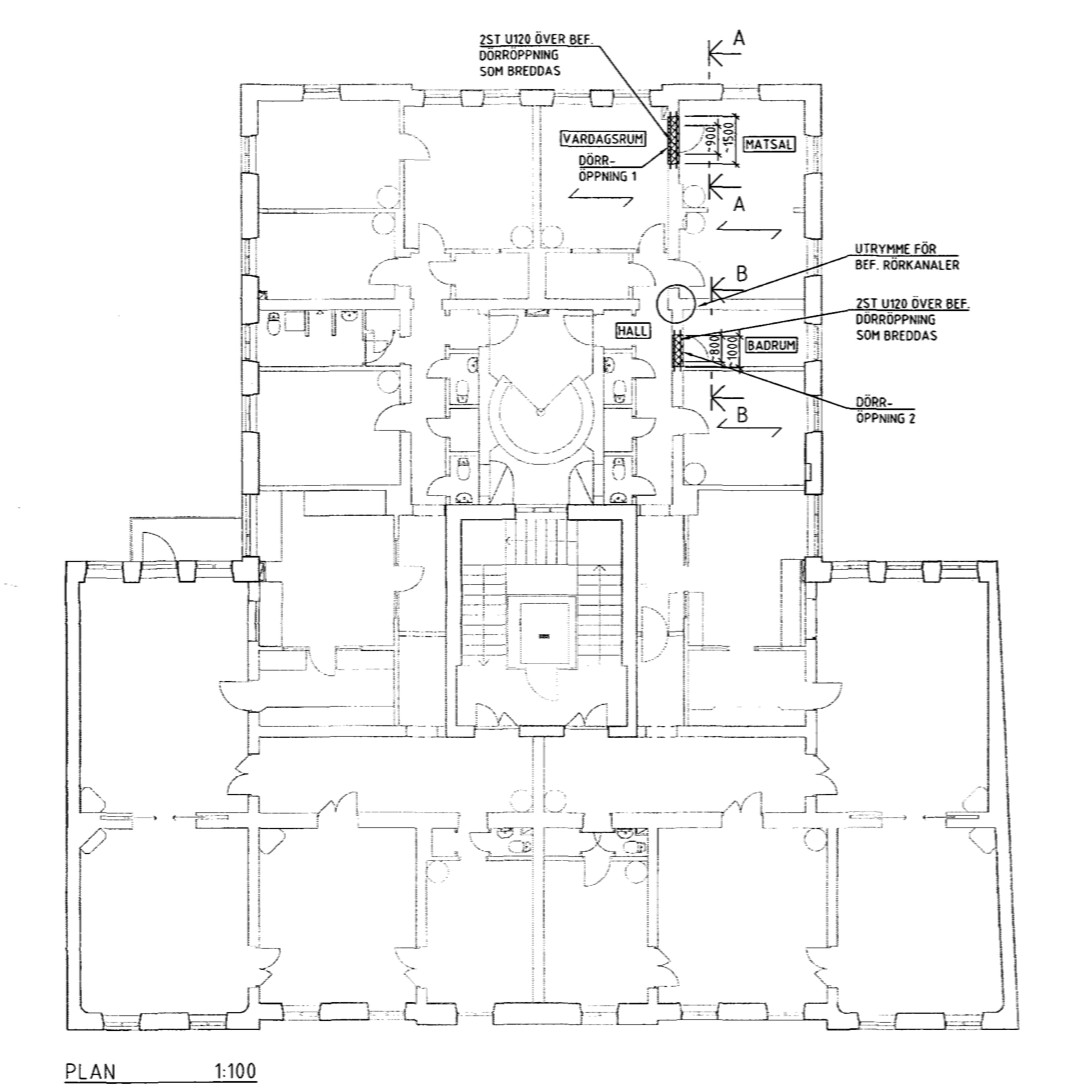 Det är ett vackert hus med en ganska komplicerad uppbyggnad. Bjälklag vid den här tiden var antingen uppbyggda av stålbalkar eller träbjälkar eller kombinationer av dessa material. Bjälkarnas riktning kan variera över planet. Bärningen ligger i de murade väggarna, ytterväggar och vissa hjärtväggar. Din vägg är en brädvägg, inte en plankvägg. Att den inte har någon bärande funktion framgår tydligt av foto nr 2 där brädorna slutar i luften ovanför dörrkarmen.