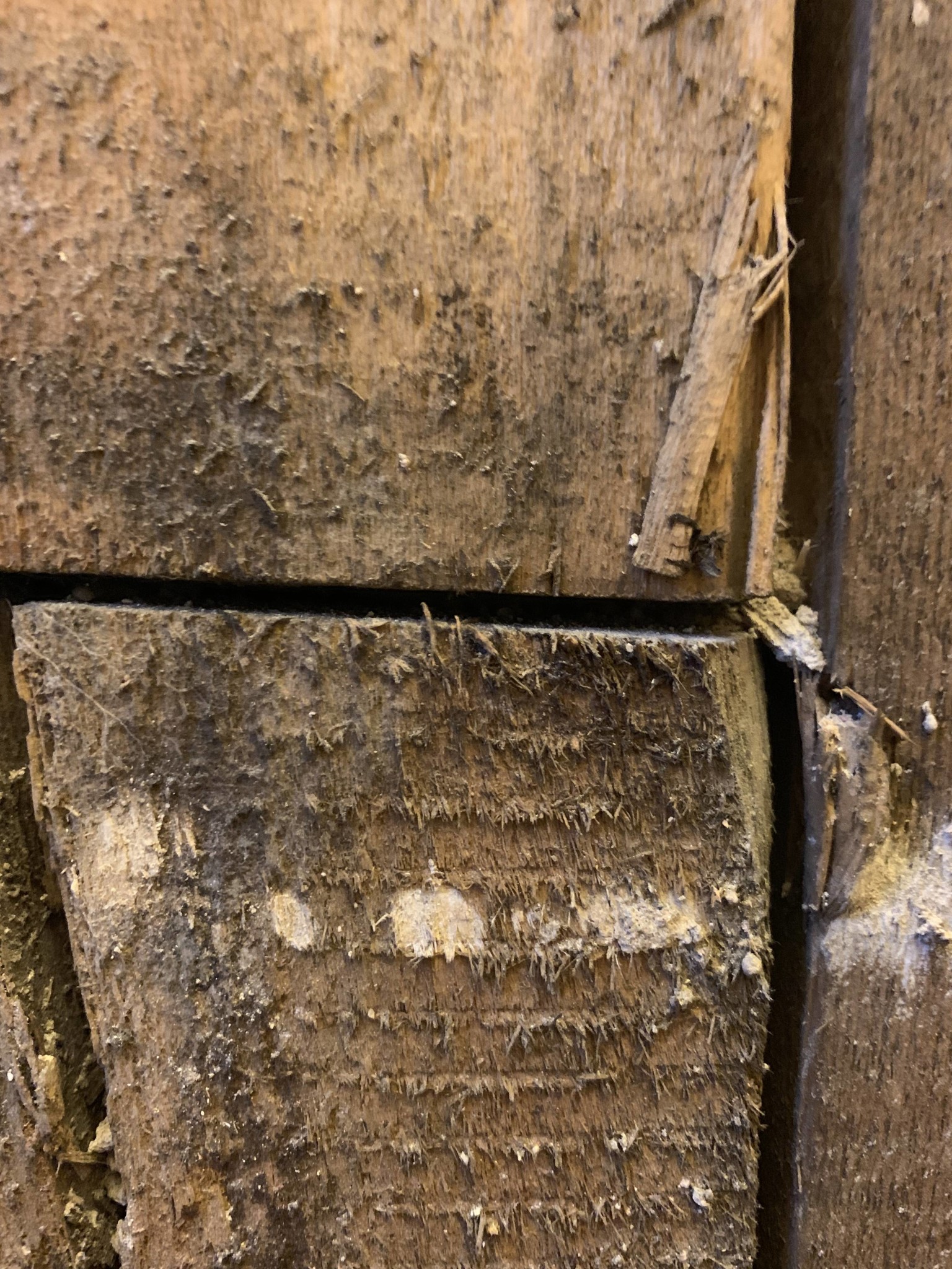 • Närbild på träytor och fogar i en träkonstruktion med synliga spår av sågning och fragment.