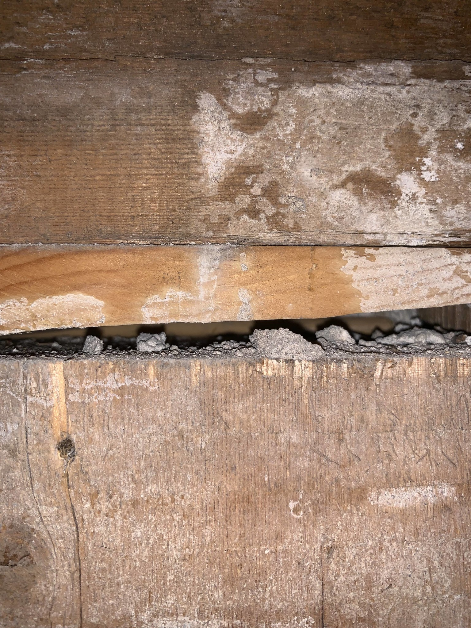 Bjälkarna går ner till våningen under. Men det är luft mellan vissa ändar på bjälkarna.
