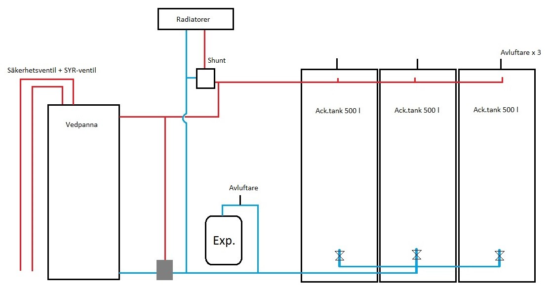 Jag kom över en begagnad vedpanna (vedolux 30) med tillhörande acktankar (3 x 500 l ). Innan satt en gammal kombipanna i huset. Nu är den utriven och den "nya" skall in.