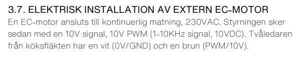 Detta tolkade jag (enfaldigt?) som att det borde gå att använda en Shelly 0-10v dimmer för att styra motorn. Tänkte nämligen försöka skapa ett system med förhöjd nattlig ventilation i vårt självdragsventilerade hus, och för att bibehålla funktionen av vredet på själva köksskåpsfläkten i köket så tänkte jag läsa av motsvarande styrsignal med en Shelly addon som ju skall kunna läsa en 0-10v-signal. Men, sen läste jag lite mer och hittade att styrsignalen är en PWM-signal: