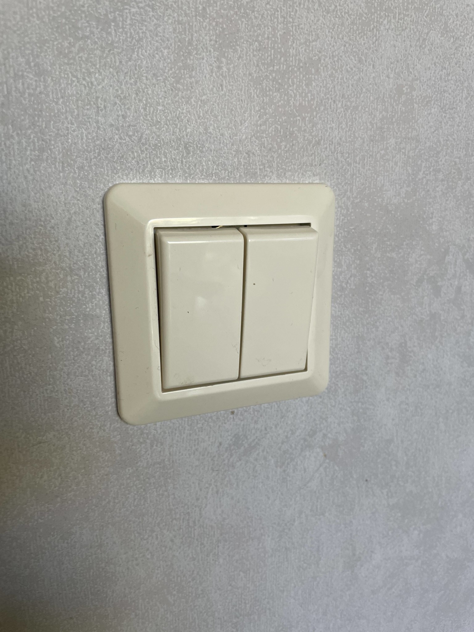 Det sitter en ELKO dubbel strömbrytare enl bild. Den högra tryckknappen går till ett lamputtag på vägg, den vänstra till ett lamputtag tak med orange ledare .. se bild.