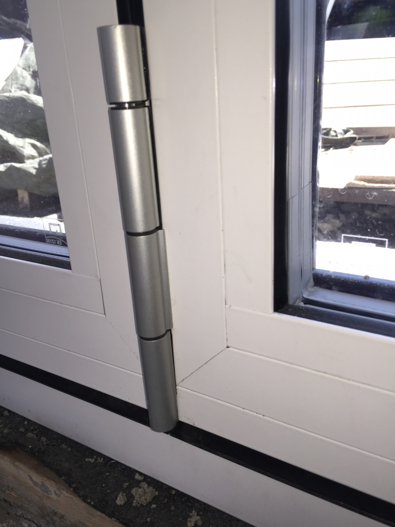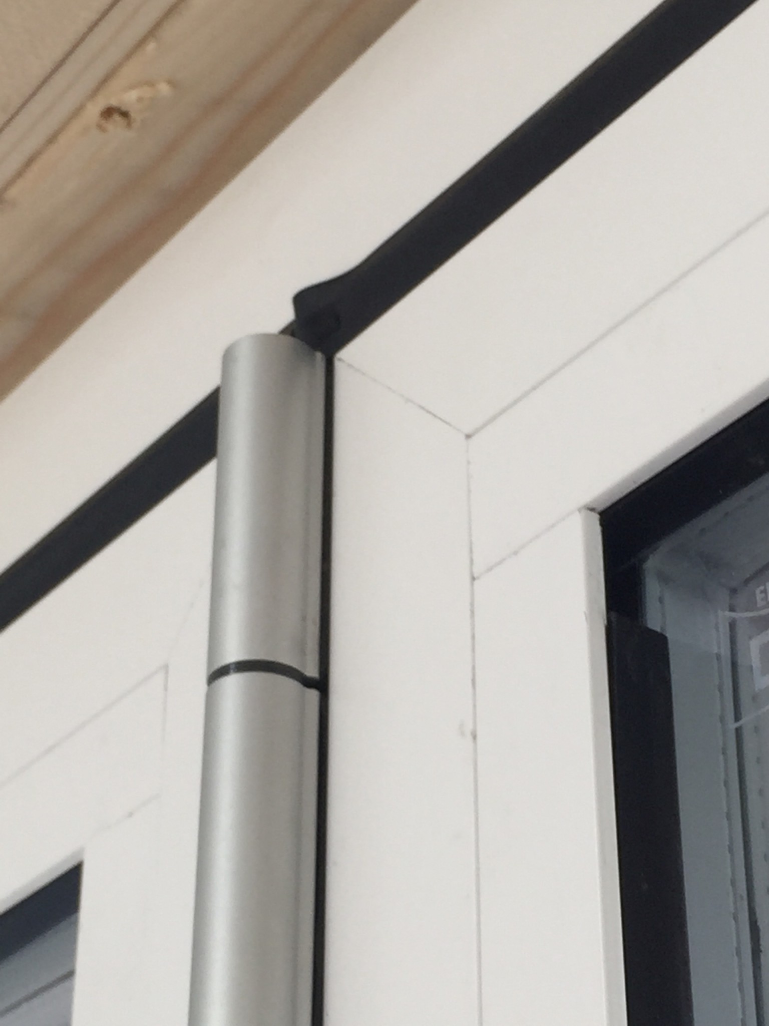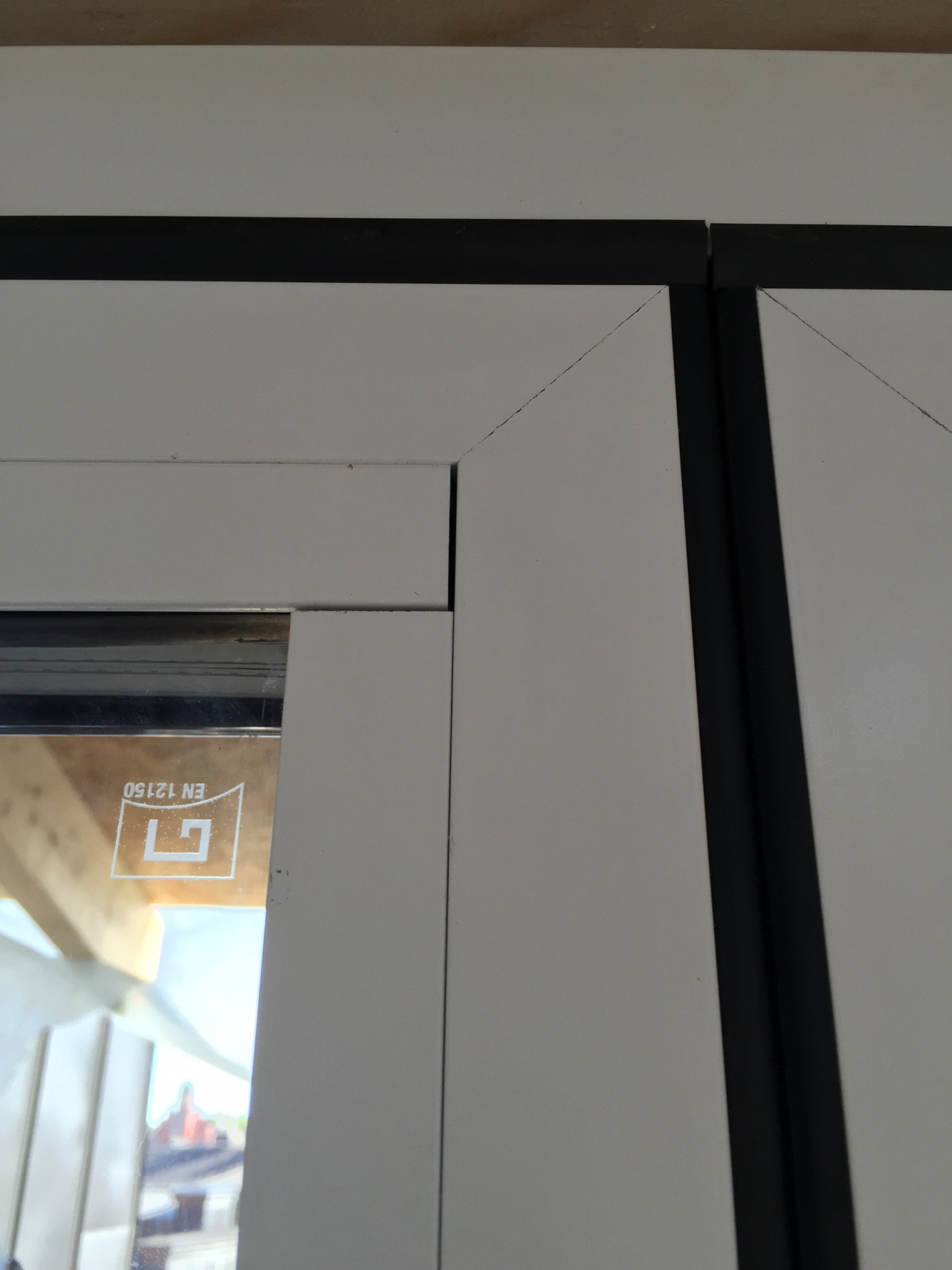 Själva glaskassetterna som är monterade i respektive dörrbladsram sitter skevt i förhållande till ramet - enligt montörerna är detta precis som det skall vara eftersom "glaset håller upp ramen", men det syns ju och jag tycker det ser lite konstigt ut. På bilden nedan visas vad jag menar, syns bäst på högersidan, där den silvriga ramen kring glaskassetten i nederkanten av fönstret livar med den yttre (mörka) listen, medan den i överkant ligger över en cm längre in/till höger. (Den vita listen blir lite missvisande eftersom den övre bilden är tagen ur grodperspektiv.)