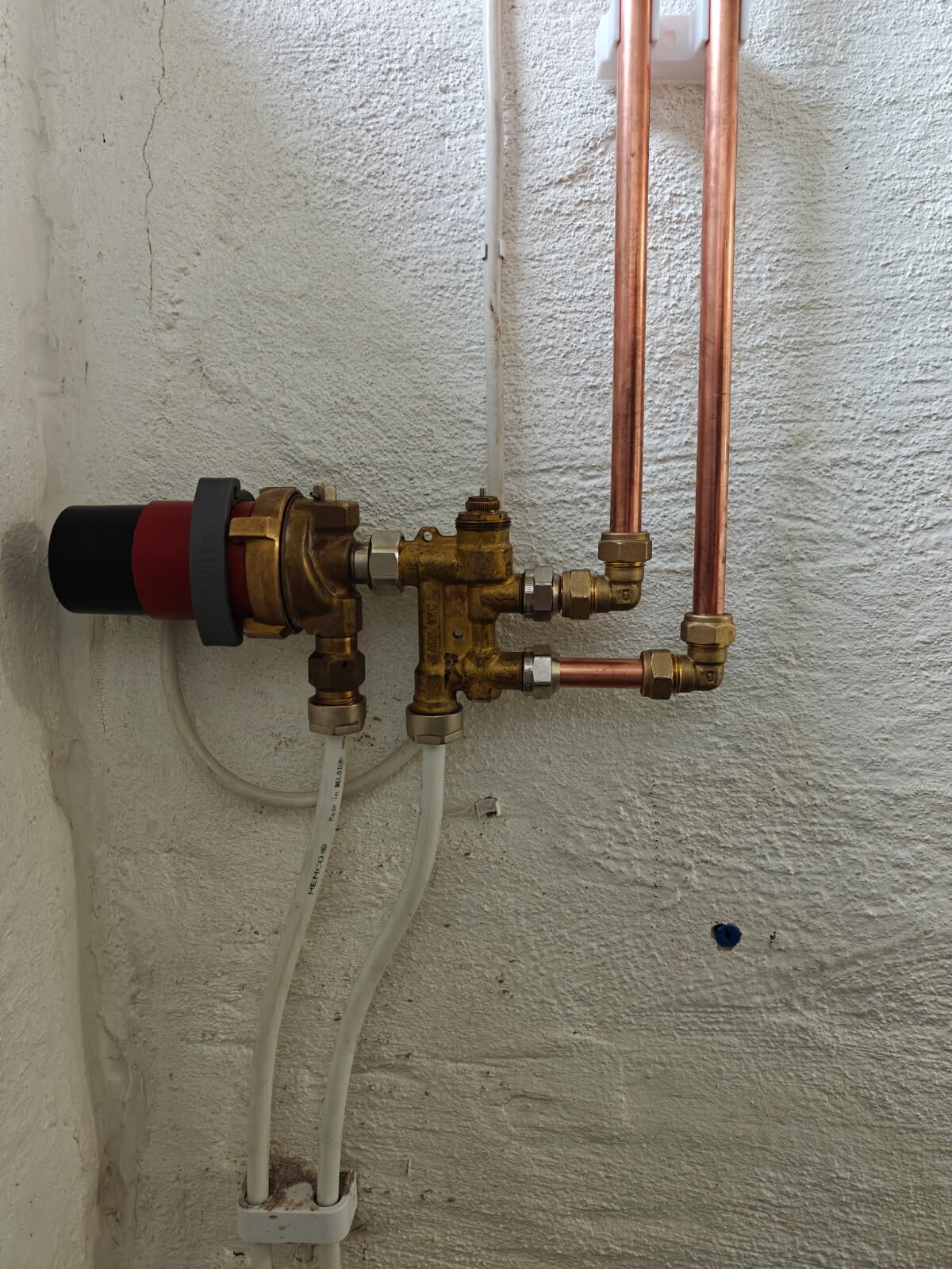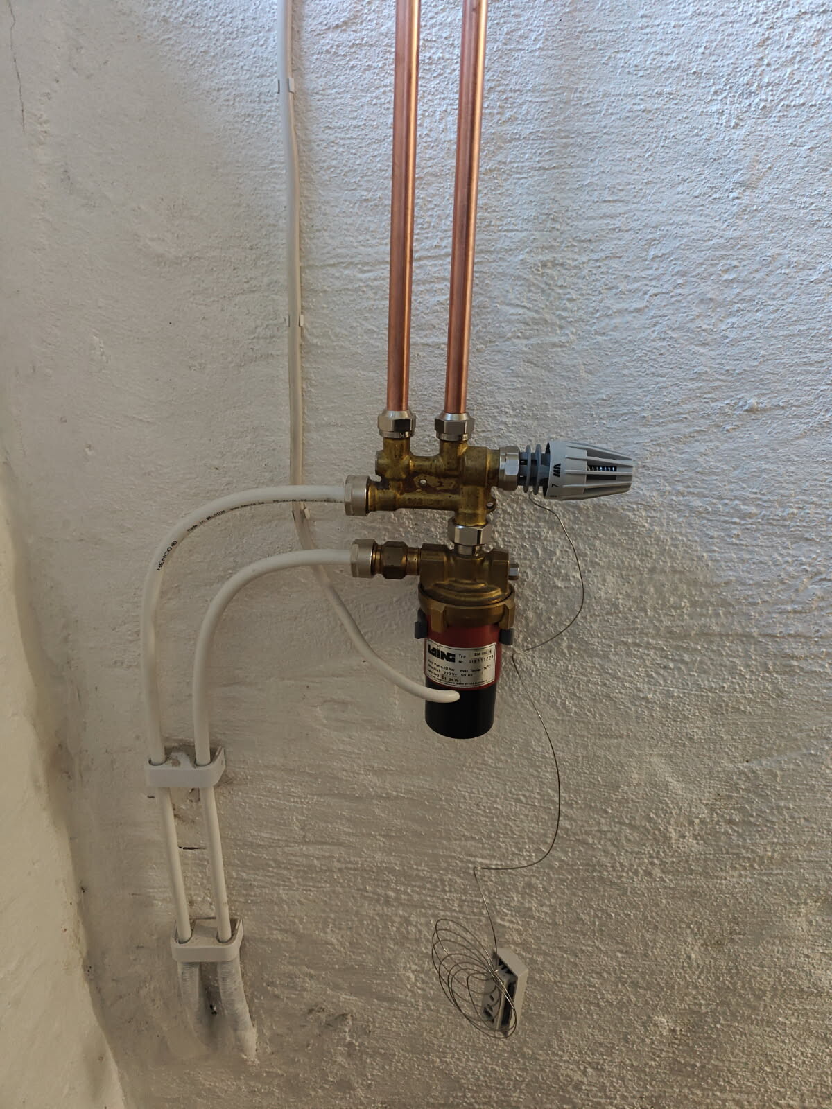 Nu är jag inte säker, men har aldrig sett en sådan pump, monterad så. Bara horrisentalt, det sitter en lös impeller i den och den kanske inte drar vatten som den ska i ditt läge. Den suger in på centrum och kastar ut till vänster ( trycksida ) Är det röret som går ut till GV. Sen det med termostaten, det är en rumsgivare och inte för tempen ut till GV och ska sitta i det rum som betjänas. GV brukar alltid ha en termostat på utgående temp till GV , som sitter i röret ut. Maxa termostaten och kyl bulben med is från frysen, blir rören varma då. Så känner den av rummets temperatur och det kan vara varmt av olika orsaker, då blir det ingen värme på golvet.P Panda 66 skrev: