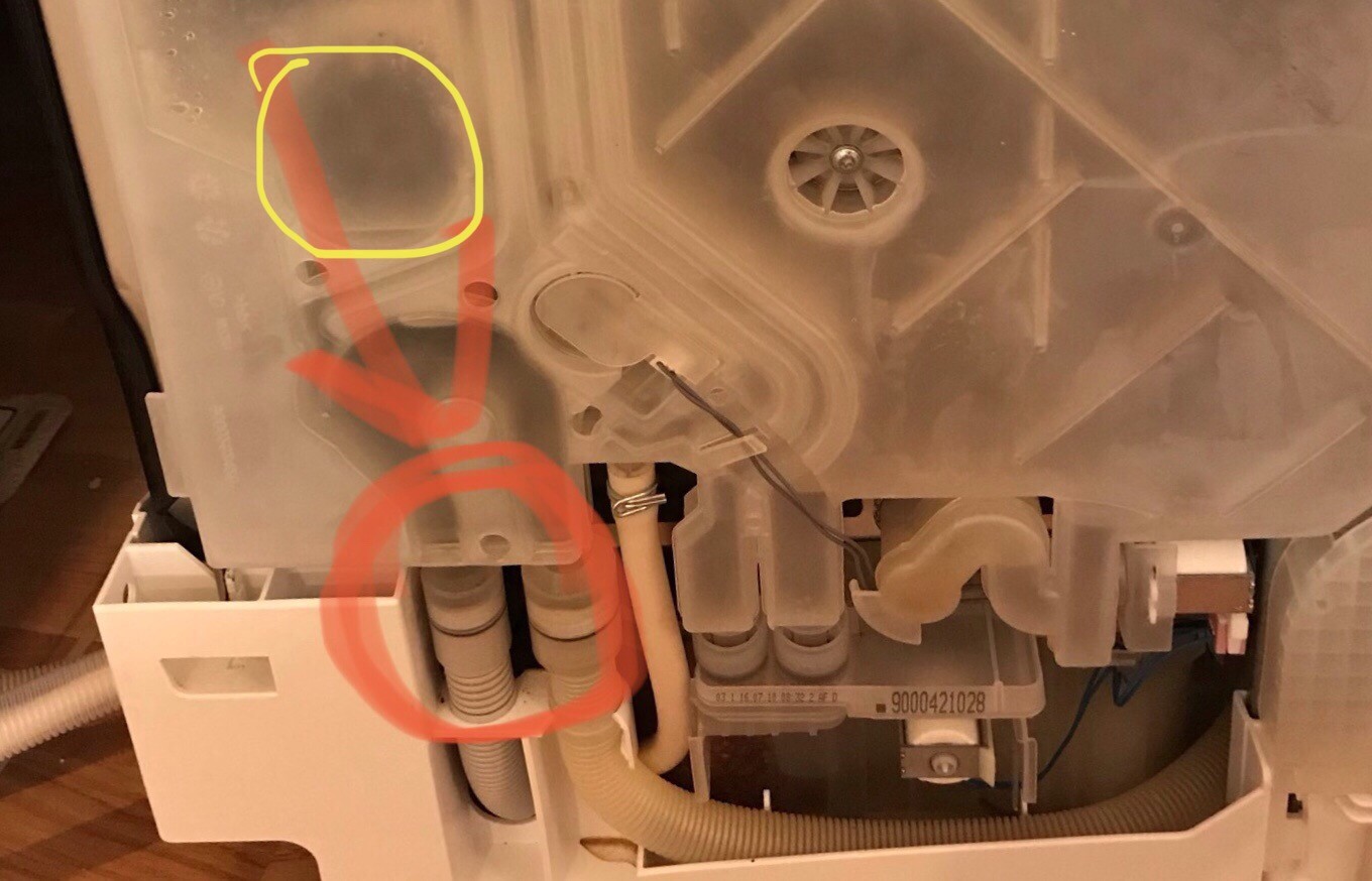 Vatten letar sig ner i maskinen med e15 som resultat. Det rinner vatten bakom det stora ”plastkanal” systemet på vänster sida. Se pilar på bild. Tips på vad som kan vara fel?