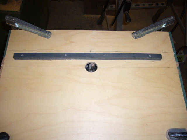 Bilden som närmast följer visar "utrustningen" utan ämne. Själva fräsen har diam. 10 mm. Grejen till vänster med två kryss har bredden 10 mm och utgör ett distansstycke. Nästa långa detalj är själva styrlisten, fastlimmad och med bredden 10 mm. Vidare åt höger ser Du fräsen. Bortom fräsen ser Du påskjutaren som löper på listen.