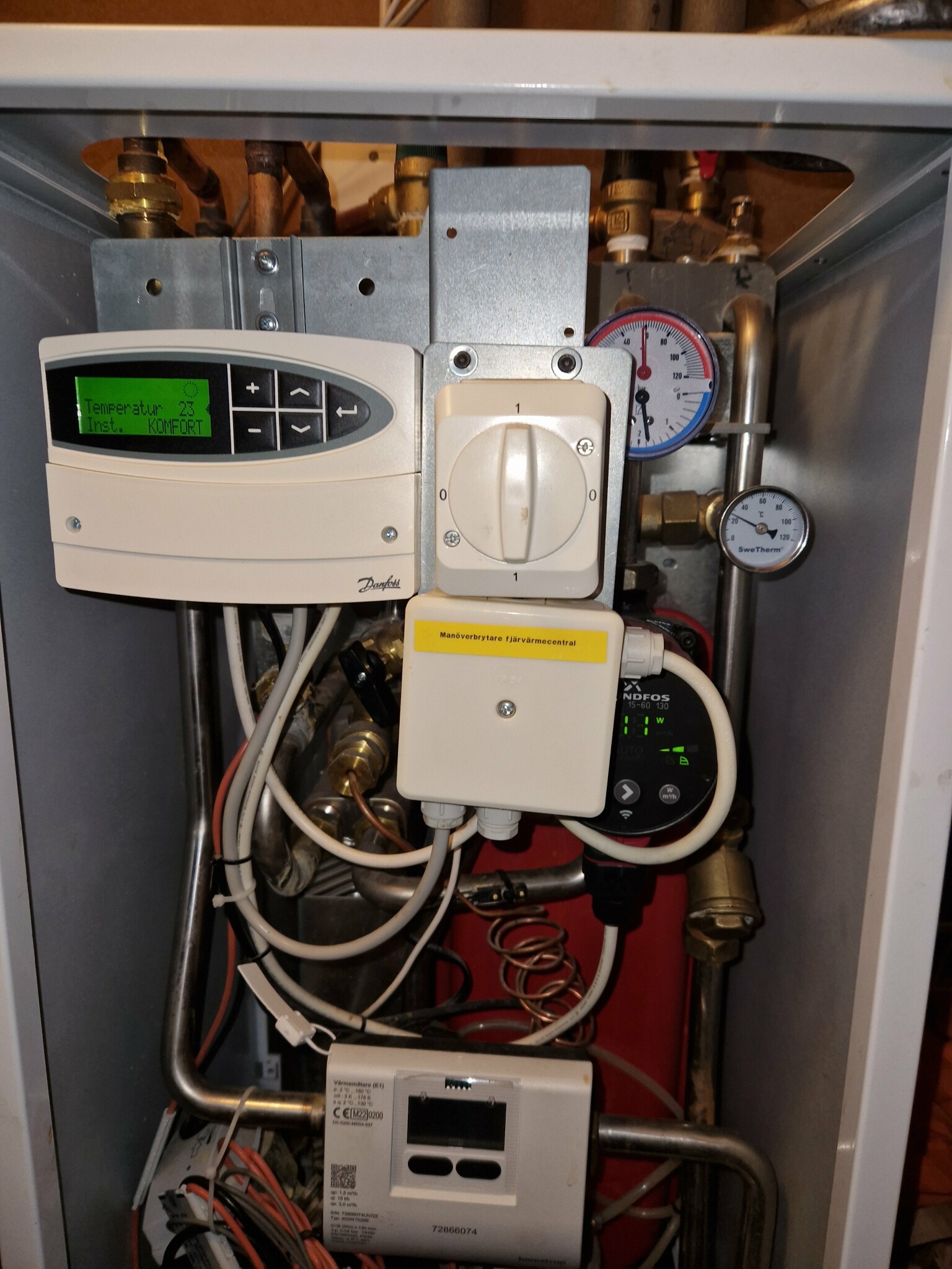 Framledningstemperaturen är också lite hög, vi har just nu 40⁰ i framledning & 31⁰ i returen, å inkommande fjv-vattnet är 73⁰ & fjv-returen är 34⁰, vi har +1⁰ ute.