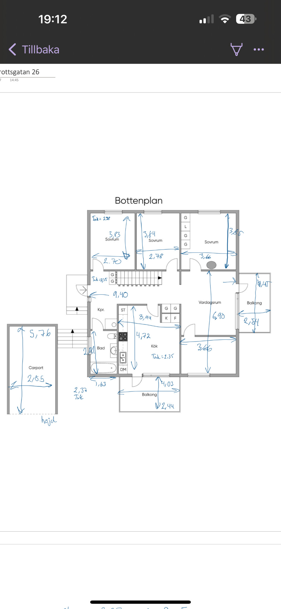 Bifogar bild med mått, väggen mellan vardagsrum och sovrum kan ni bortse från, den finns inte kvar.