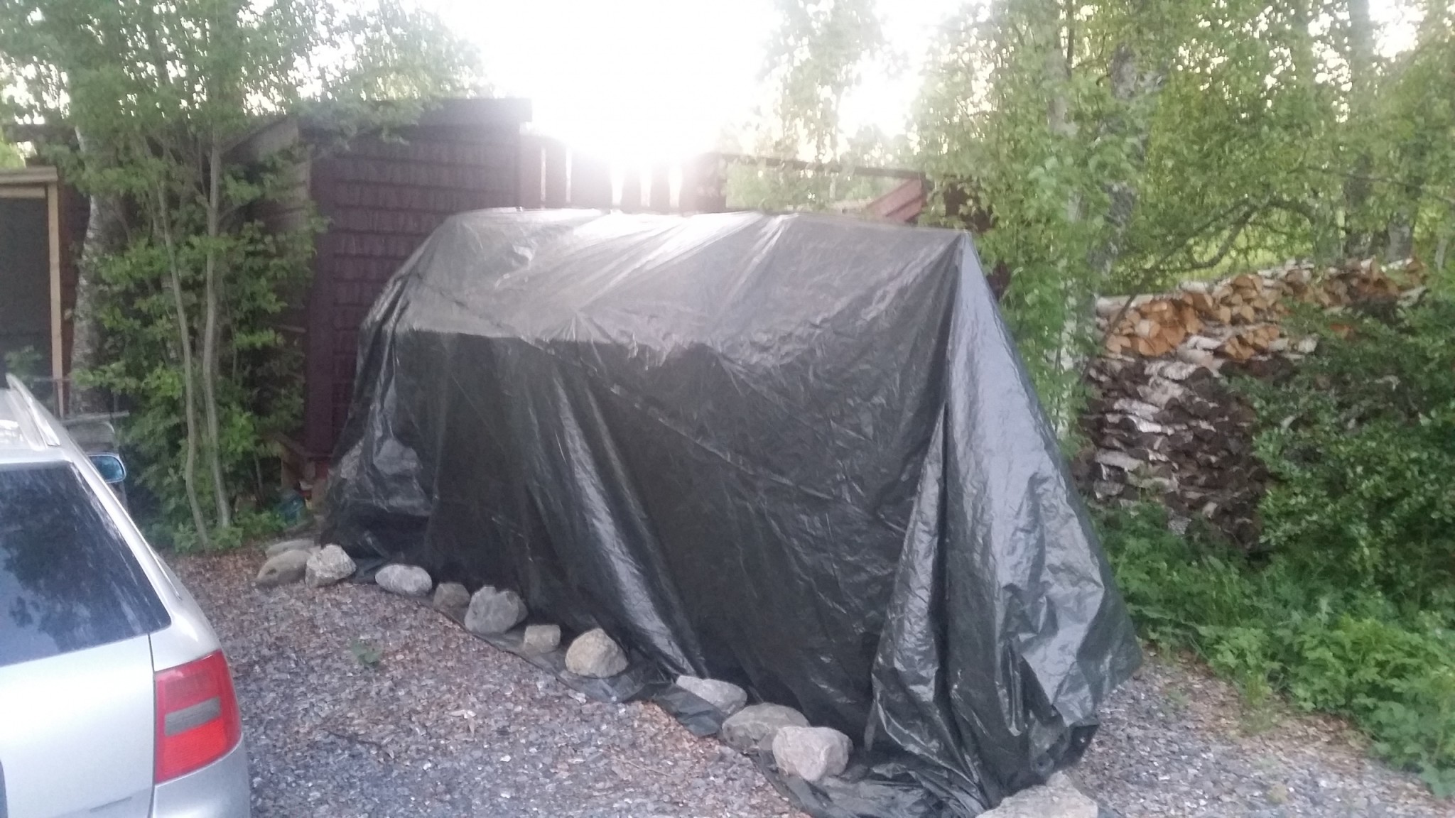 På stenkistan till vänster på bild har jag skruvat på en 28*95 på tvären på stolparna. Den är bara tillfällig så att jag kan lägga upp limträbalken när den kommer hem, för att underlätta monteringen. Balkarna är beräknade att komma hem v24. Så nu är det lite lugnt ett tag.