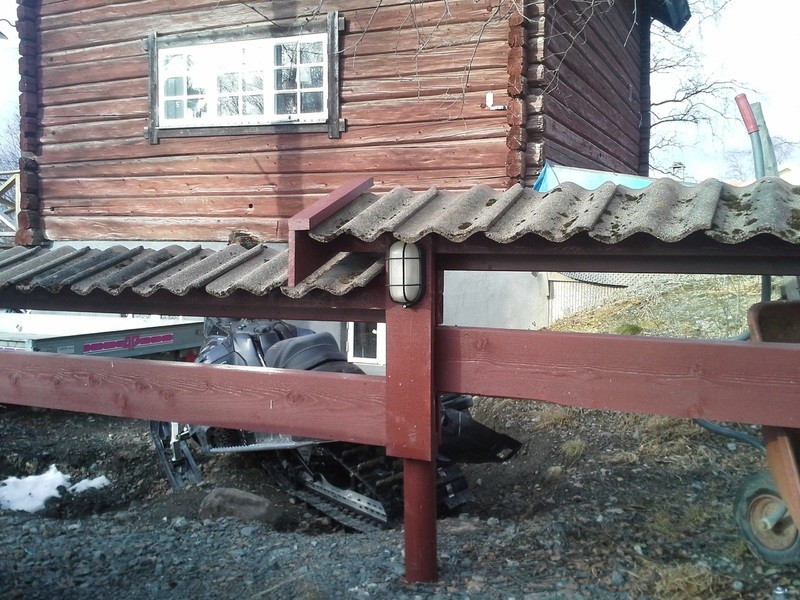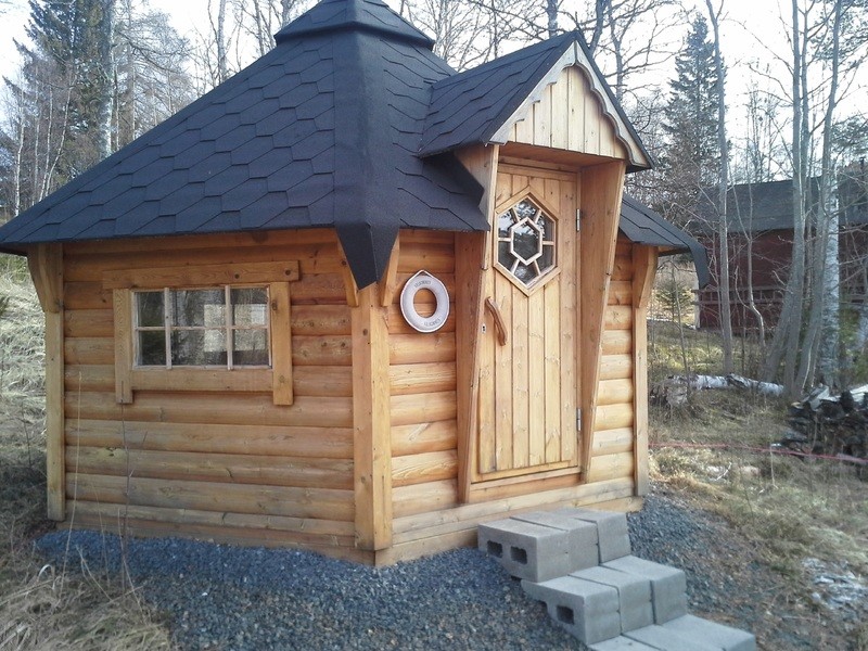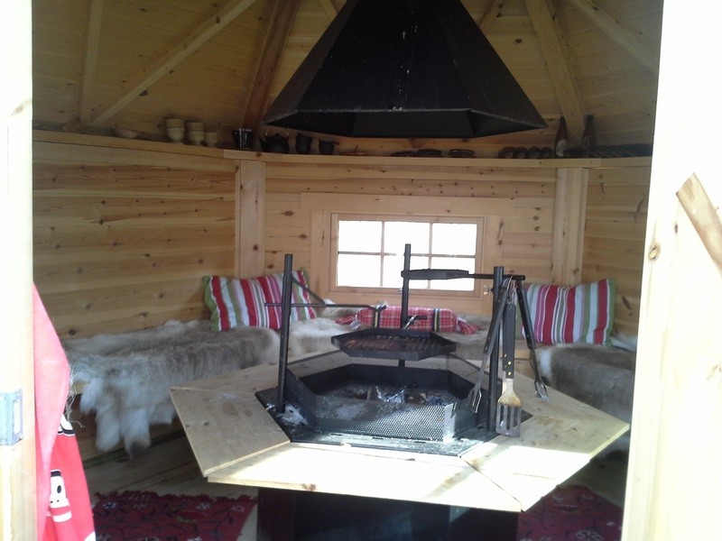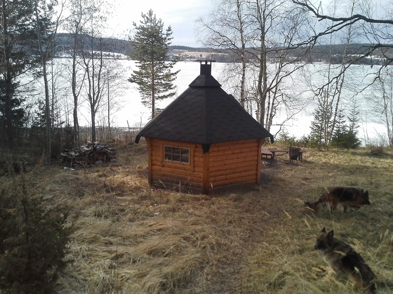 På gregoria marknaden i stan så inhandlade vi en liten grillkåta. Den transporterades ner till sjön med snöskoter. När våren kom så vart det montering.