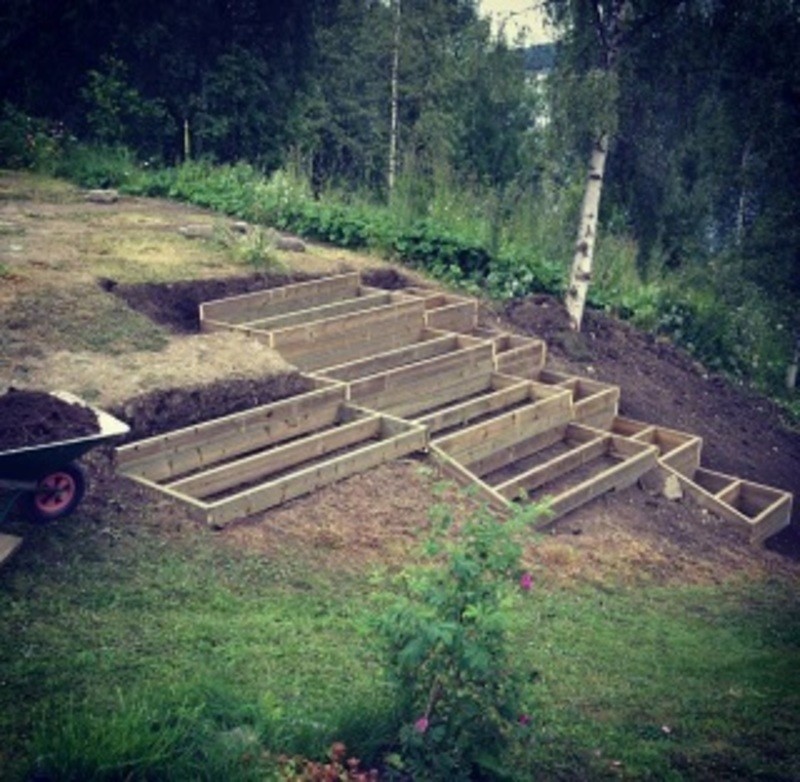 Detta område ligger precis vid husen. här fyllde jag ut med massor när jag grävde källare på huset. Därav har det inte hunnit växa så mycket ännu. Men denna "lilla " ide började med att vårt gamla jordgubbsland var fullt av ogräs.