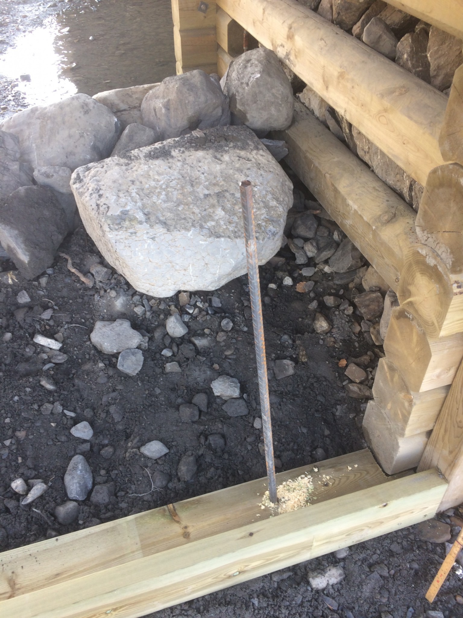 Nu har jag börjat med vågskyddet som ligger ytterst. Det är byggt med 45*145. Först en platt på backen sen en lodrätt mot den. Hål borrade genom den nedersta och 16 mm armeringsjärn nerslagna ca 80 cm ner i botten.