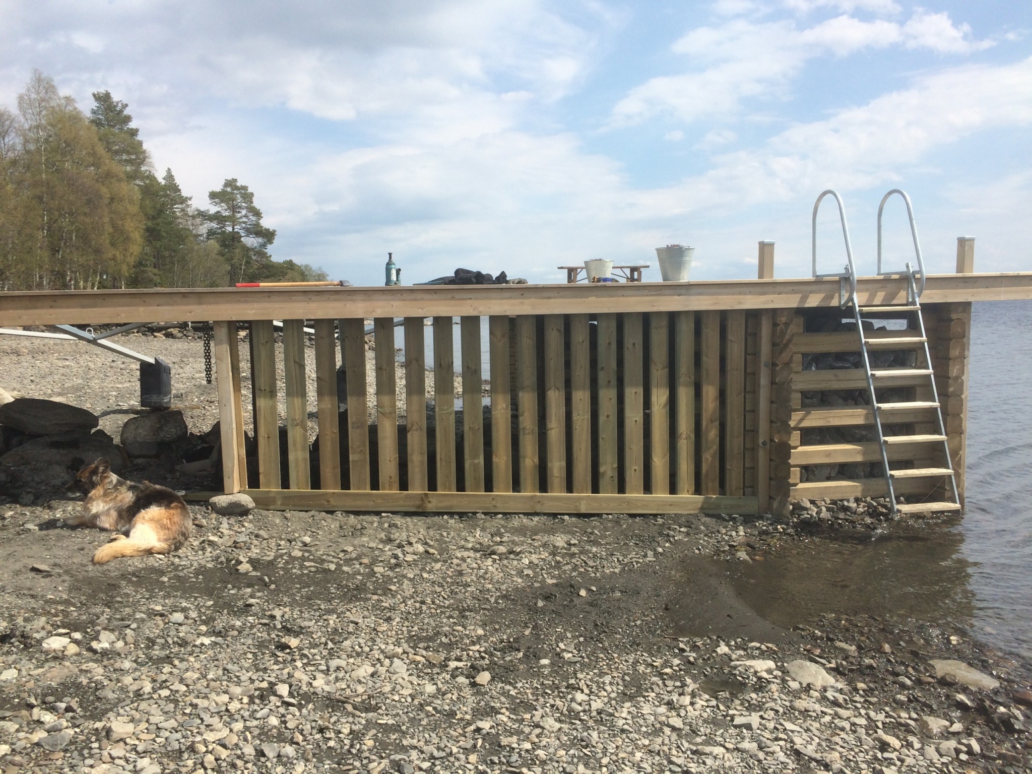Bryggan är helt oskadd efter första vintern. peppar peppar så har den inte rört sig någnting als som jag sett.just nu håller jag på att kasta in sten mellan stekistorna inne vid land, det ska bli som en mur som ska fungera som vågbrytare. mellen sten kistorna längre ut kommer jag nog att bygga vågbrytare av stående 45*145, placerade från botten och upp till bryggan.